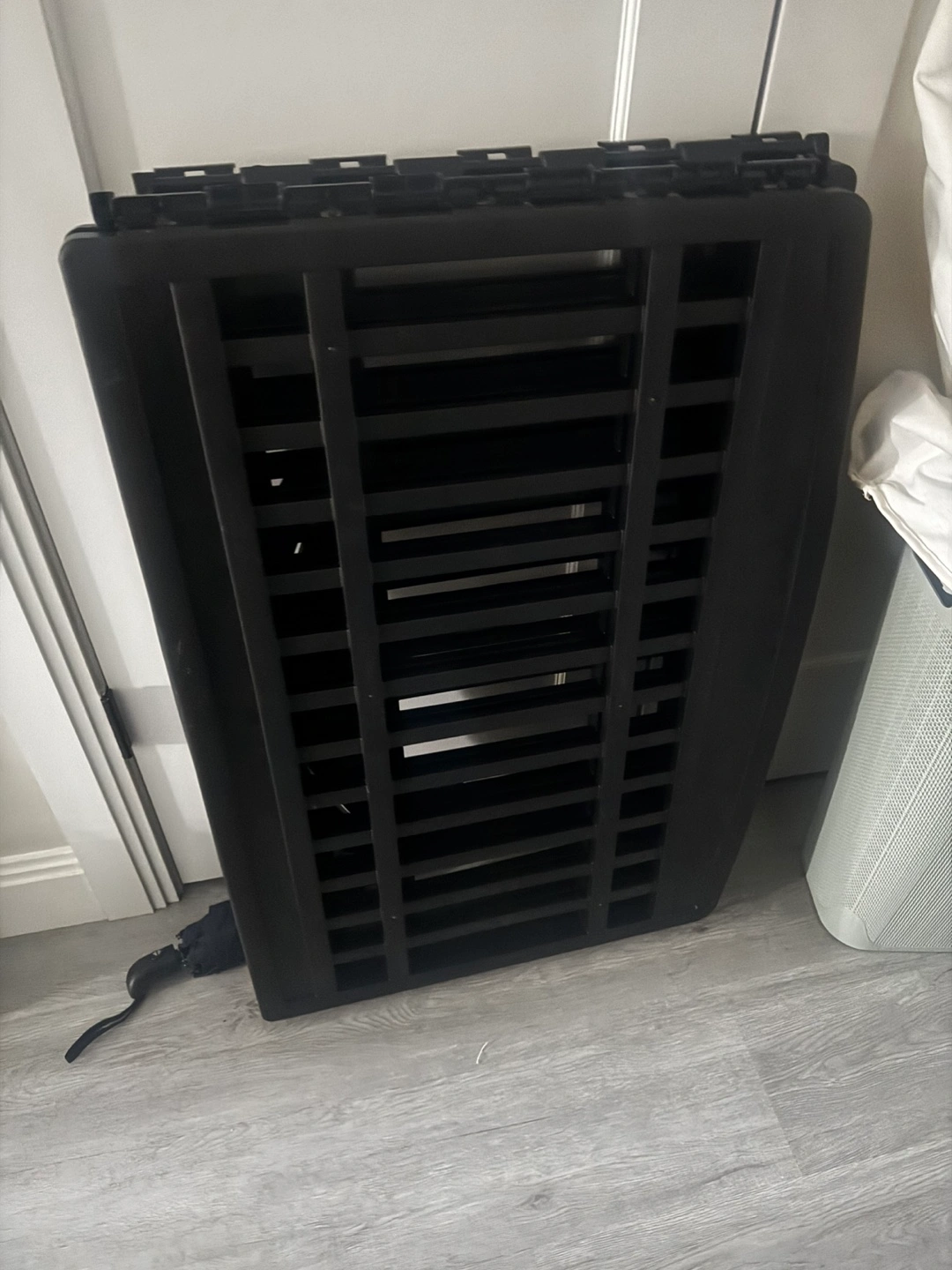 The plastic grate is black and rectangular, designed with horizontal slats. The top of the grate has a ridged design. You can use this to help promote airflow in any room you desire.
