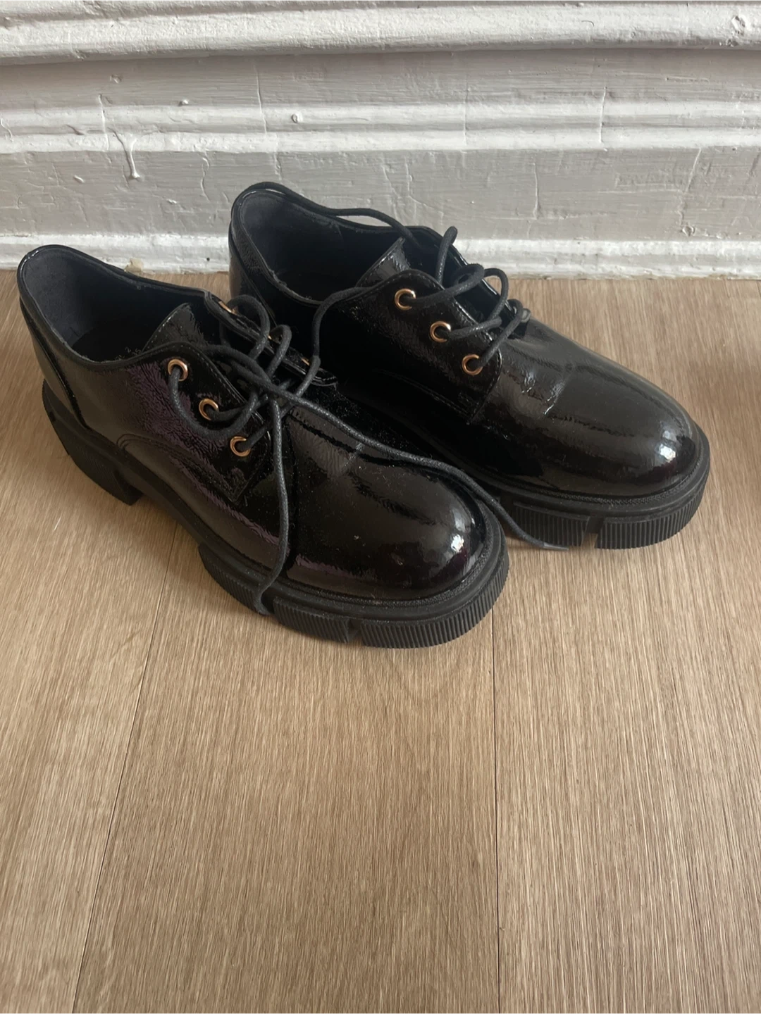 These black platform lace-up shoes are in great condition and ready for a new home! They have a stylish, edgy look with a comfortable platform sole. Perfect for adding a bit of height and flair to any outfit!