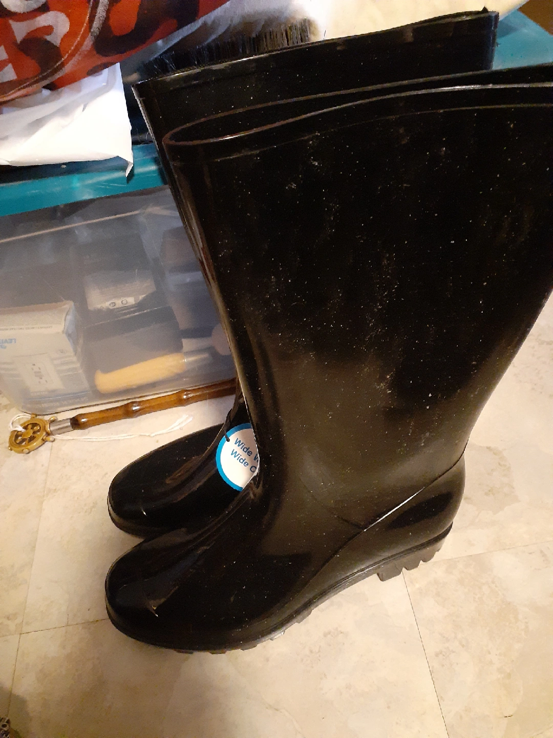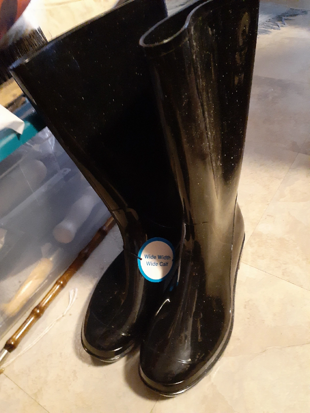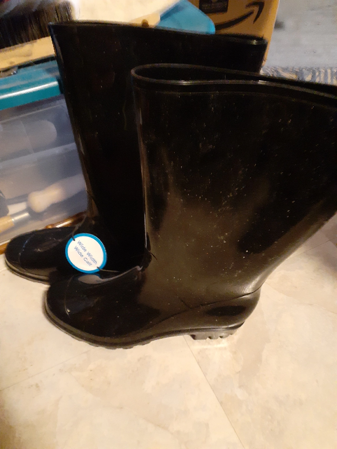 Selling a pair of black rain boots with a wide calf fit! They're perfect for keeping your feet dry on rainy days. Great for gardening or just walking around town when it's wet outside