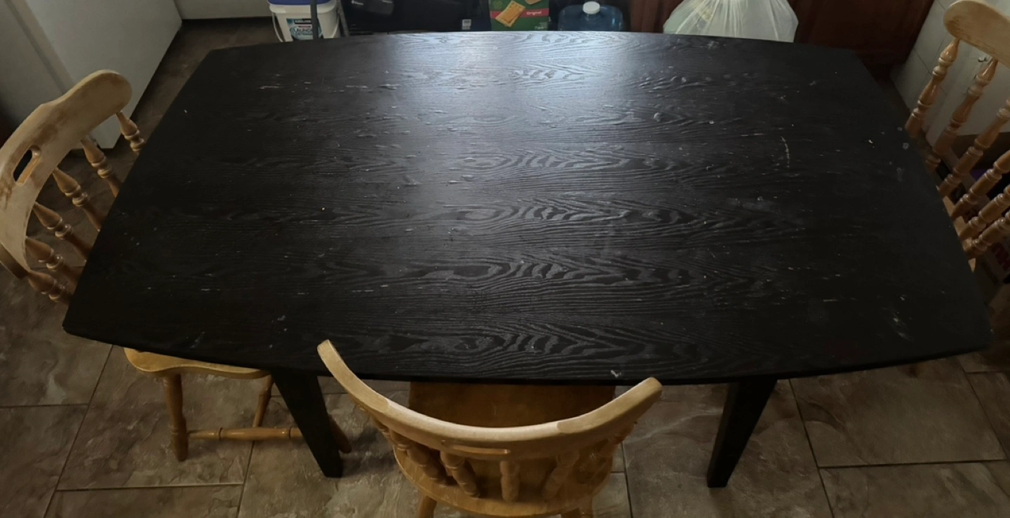 20rectangular dining table. Dark wood grain finish. Minor scratches and wear. Seats four comfortably. Simple design. 3 chairs included