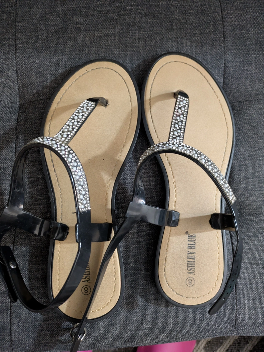 Cute Ashley Blue sandals in size 8! These sandals feature a thong style with rhinestone embellishments on the straps. Perfect for adding a little sparkle to your summer outfits!