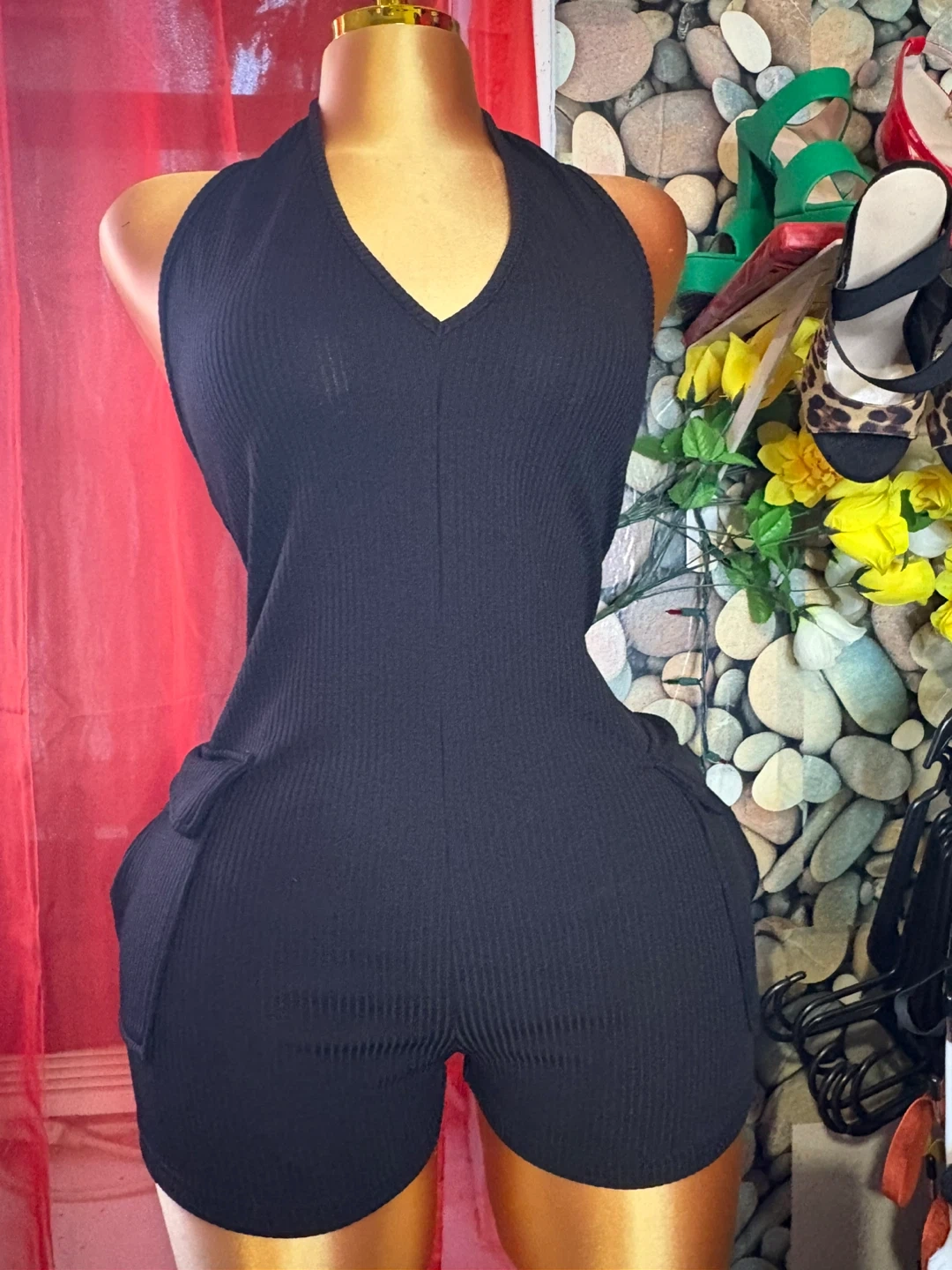 153Here's a stylish black ribbed halter romper! It's a fun and fashionable piece that's perfect for warm weather. The romper features a flattering halter neckline and a comfortable fit. It also has cute pocket details on the sides!