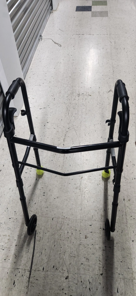 Used rollator walker. Black metal frame. Four wheels. Good condition. Lightweight and easy to maneuver.