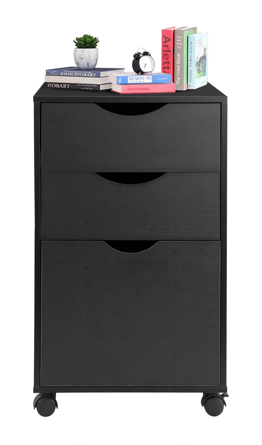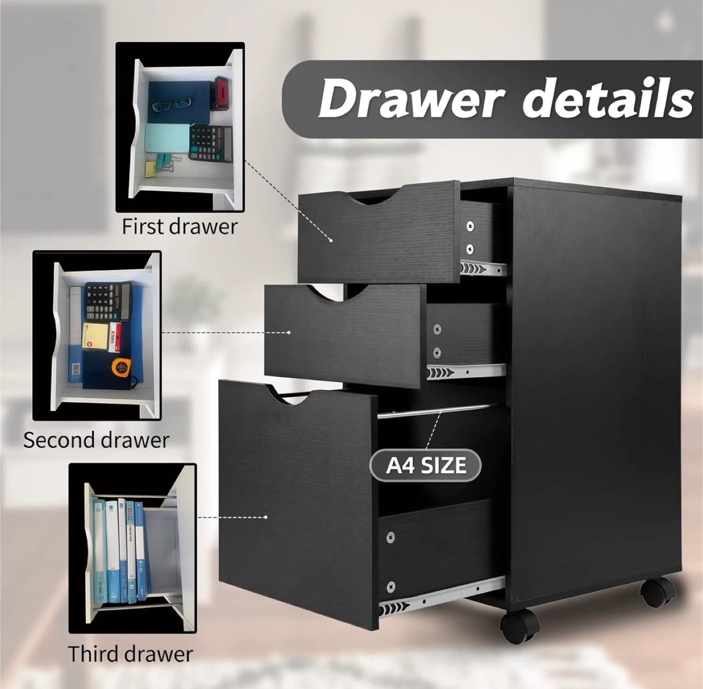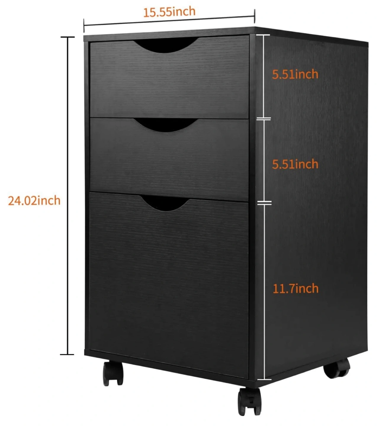 This black rolling file cabinet is perfect for keeping your documents organized! It features three drawers and smooth-rolling casters, making it easy to move around your workspace. The drawers are designed to hold A4 size documents. The dimensions are 24.02 inches (height) x 15.55 inches (width) x 15.55 inches (depth)
