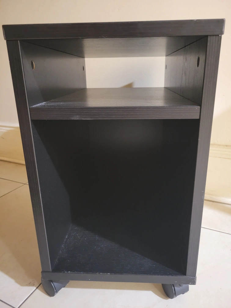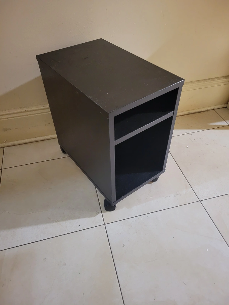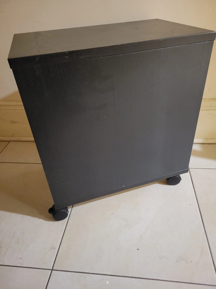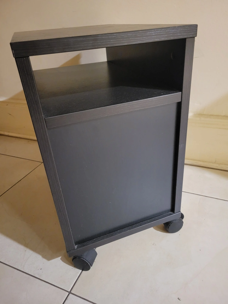92This is a black rolling storage cabinet that fits nicely under a desk or near a bed. It has an open shelf on top and a larger enclosed storage area below. The cabinet is on wheels, making it easy to move around. Great for home or office! 19 3/4"×12,5" 21,5" height