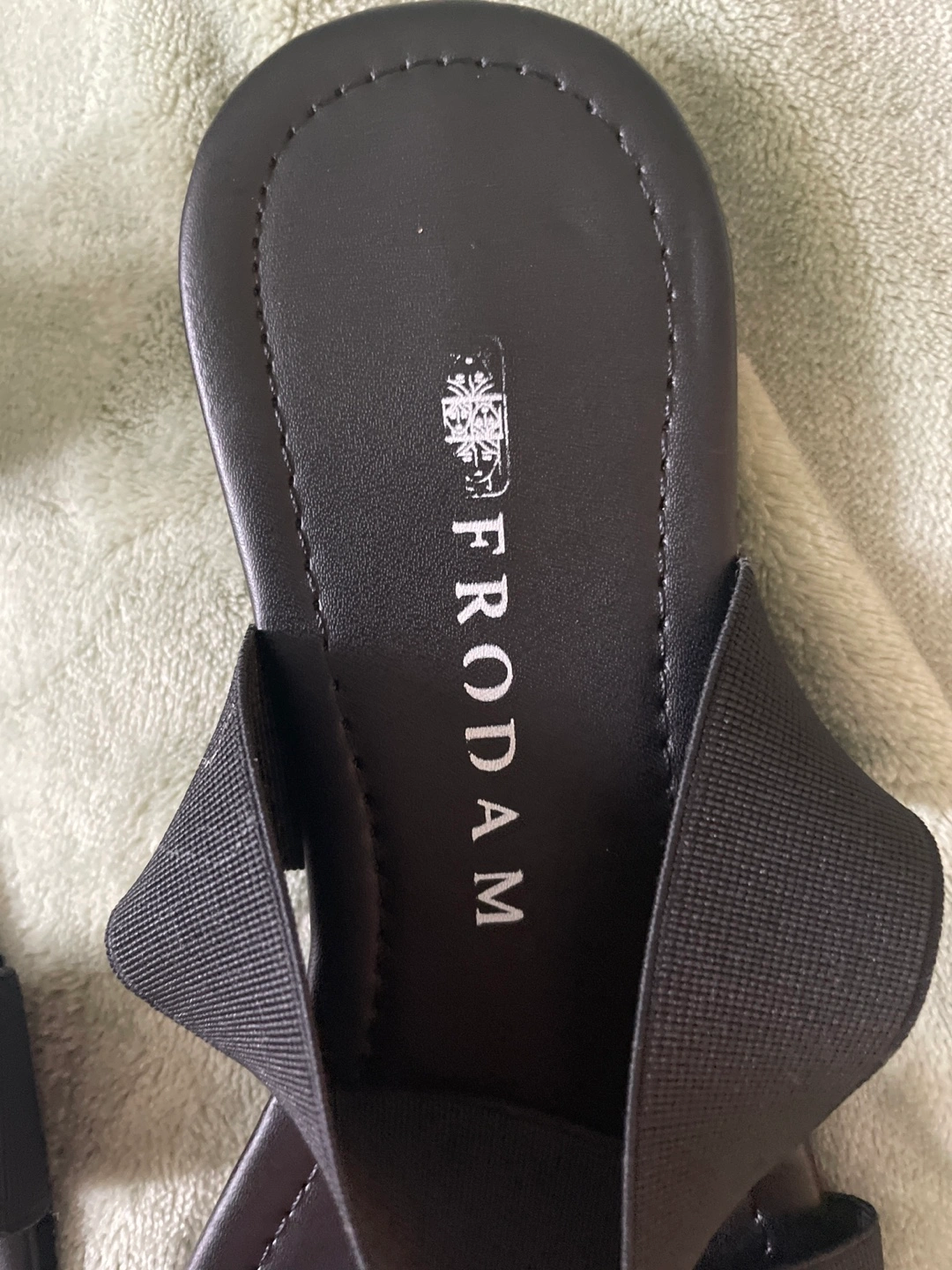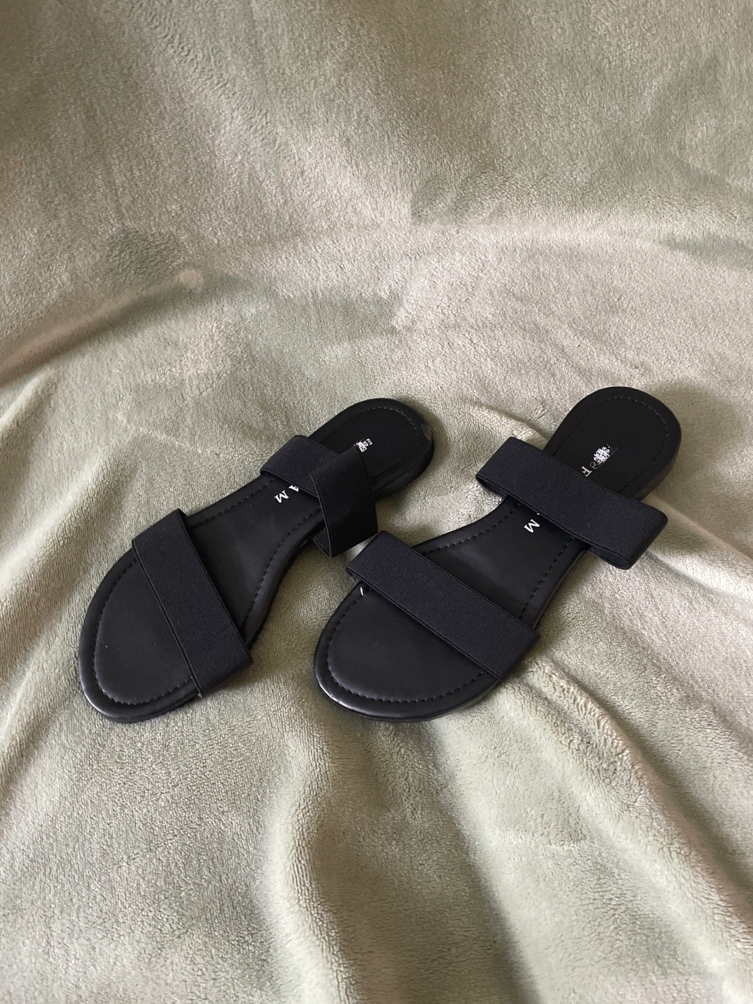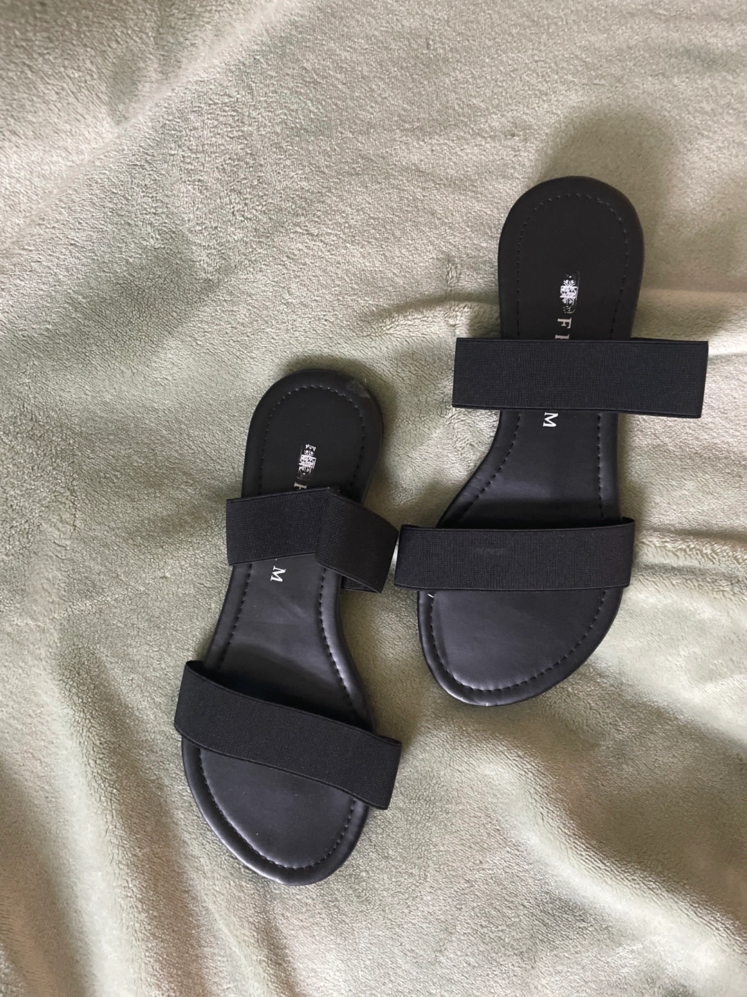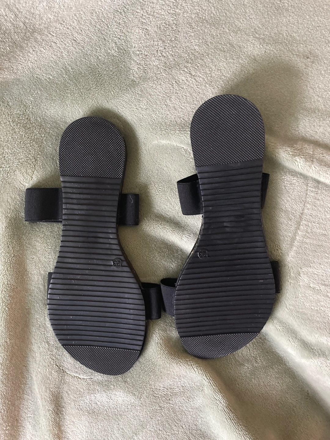 Black sandals. Features elastic straps, providing a comfortable fit. A great choice for warm weather relaxation. Only used once. Size 6 Smoke free home