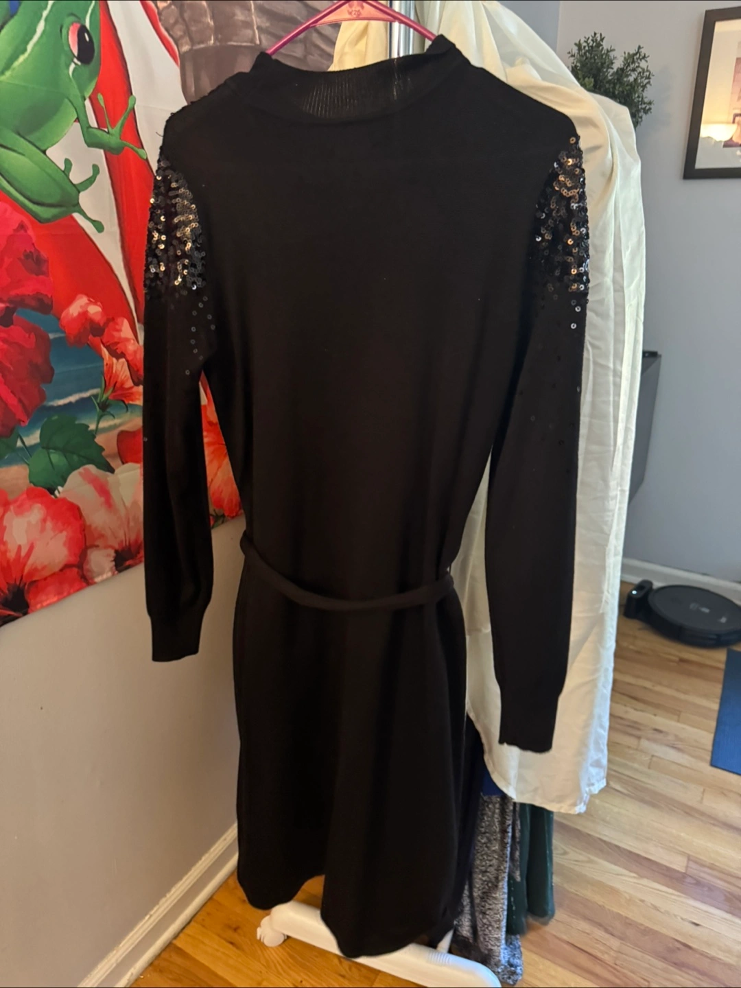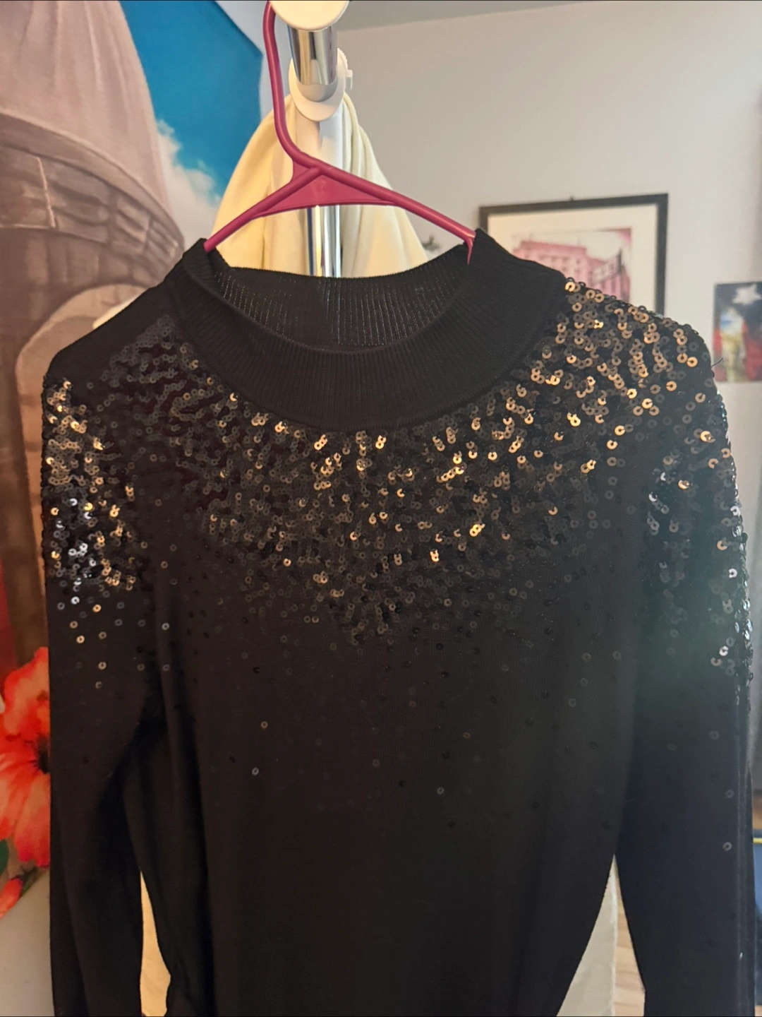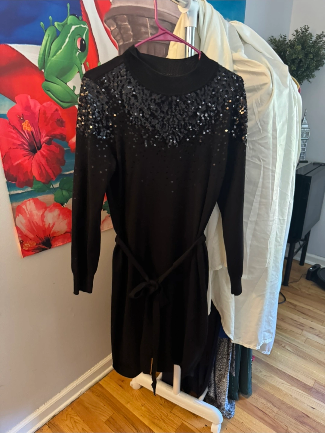 10Selling a black dress with sequin detailing around the neckline and shoulders. It also has a tie around the waist. Perfect for a night out!