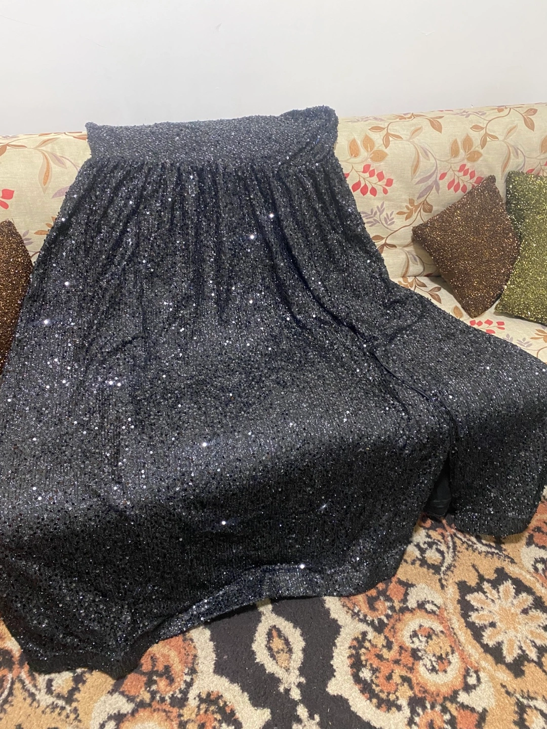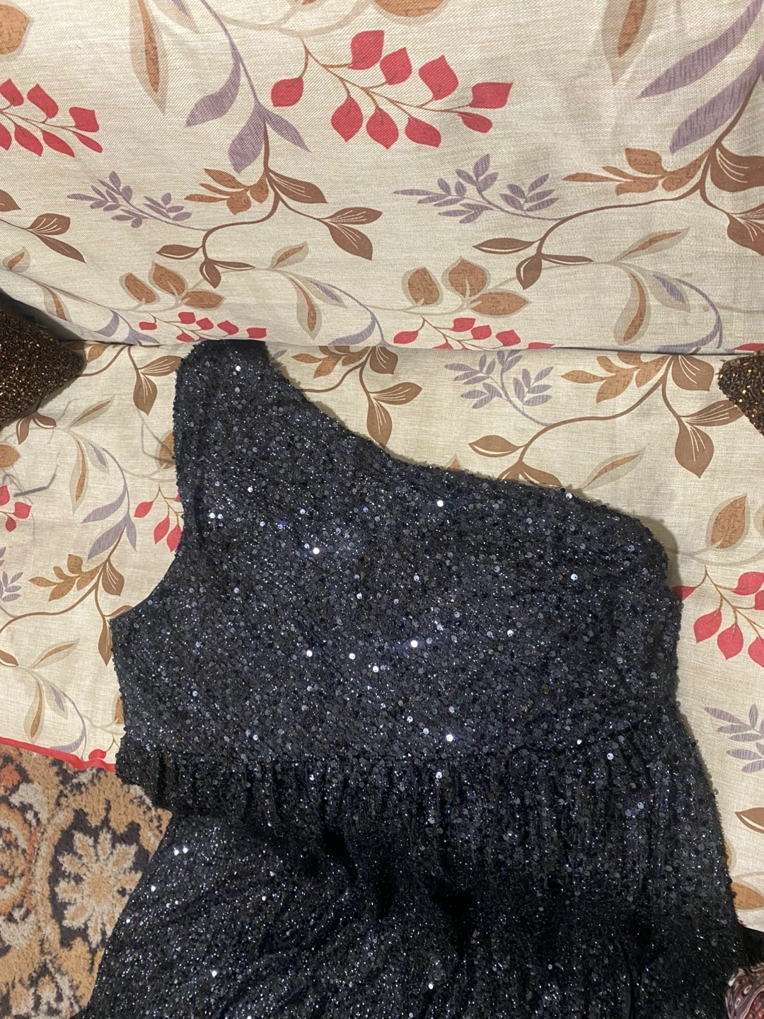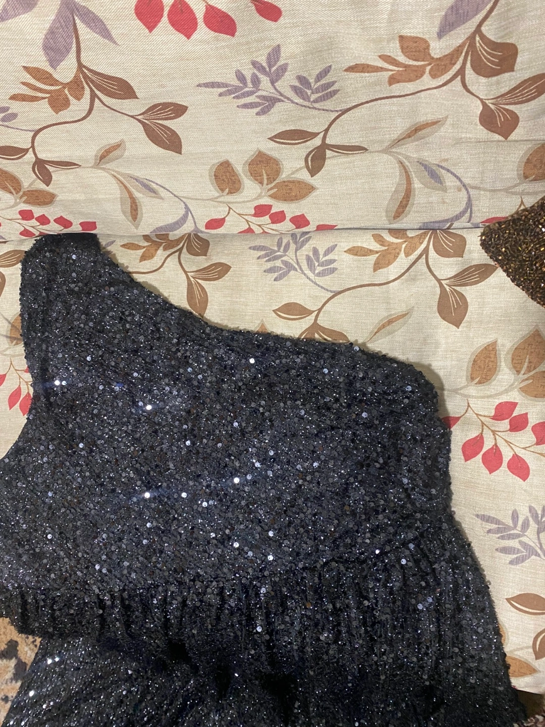 Sparkly black mini dress. One shoulder design. Sequin fabric. Great for parties or special occasions.