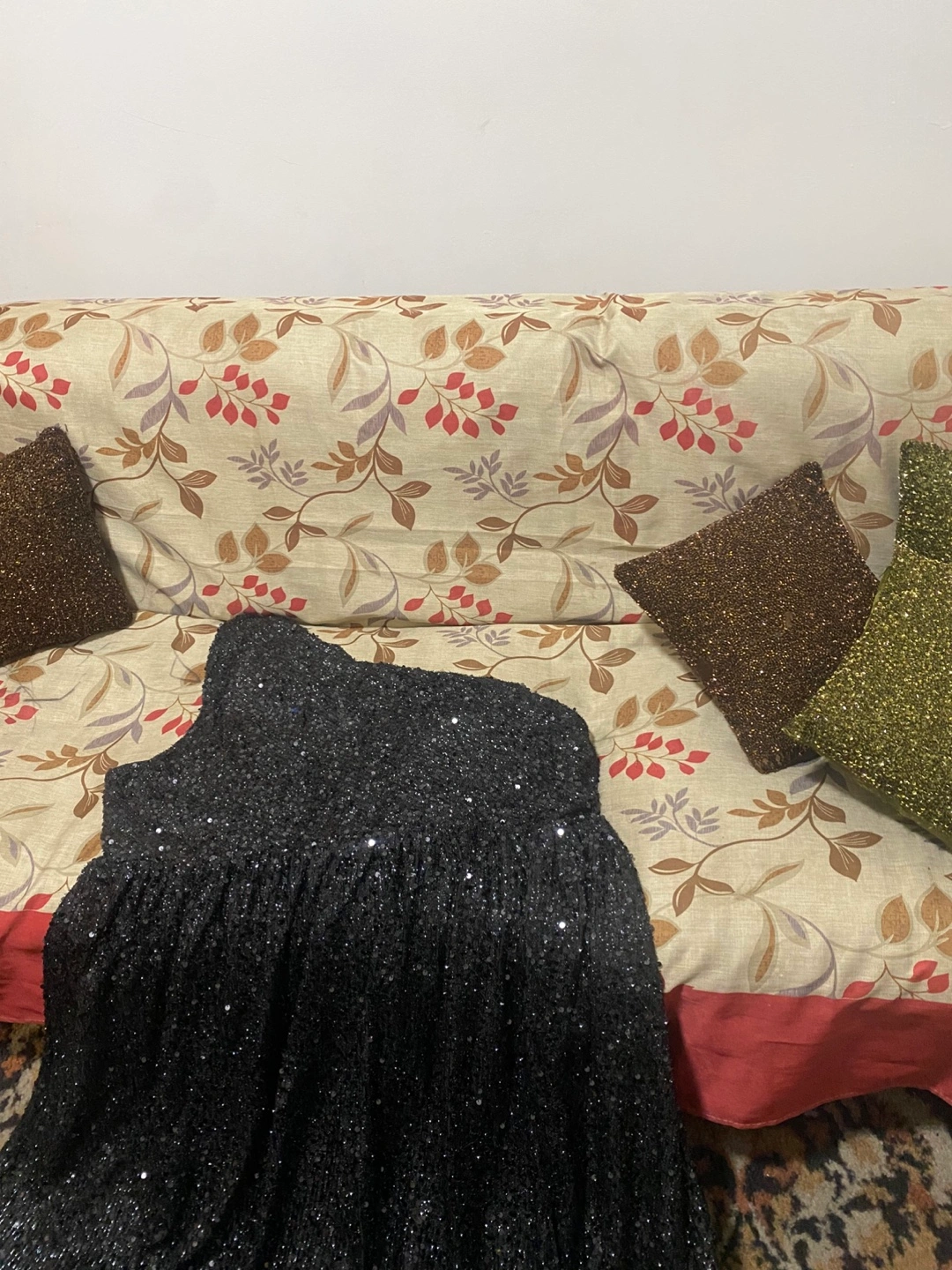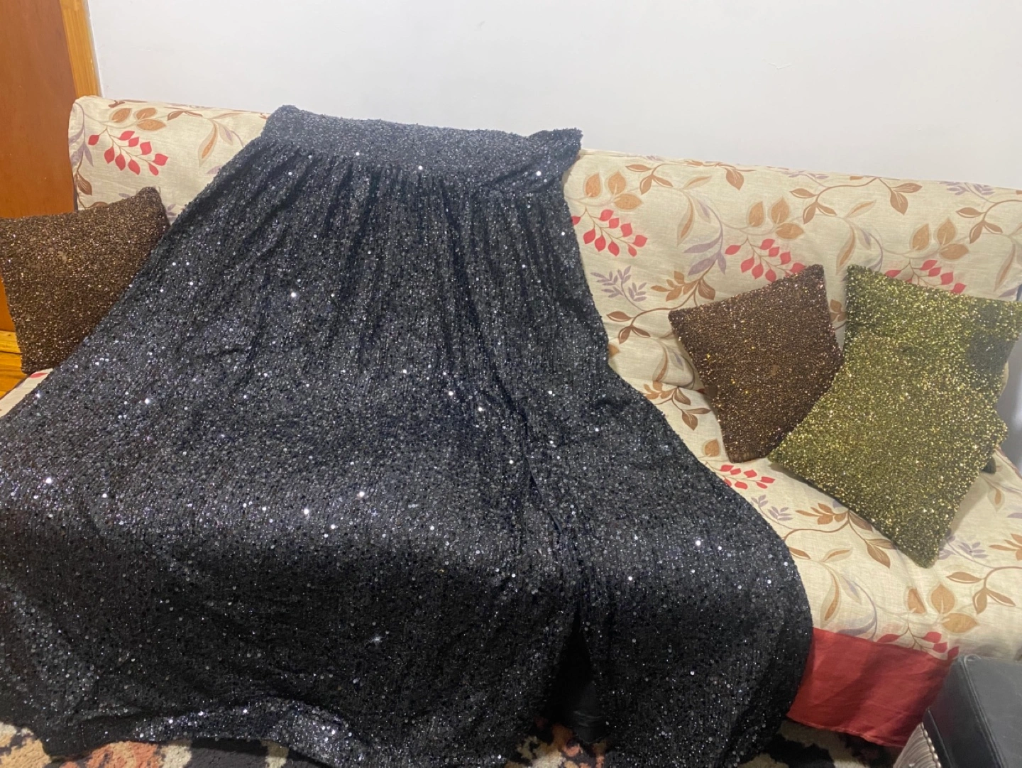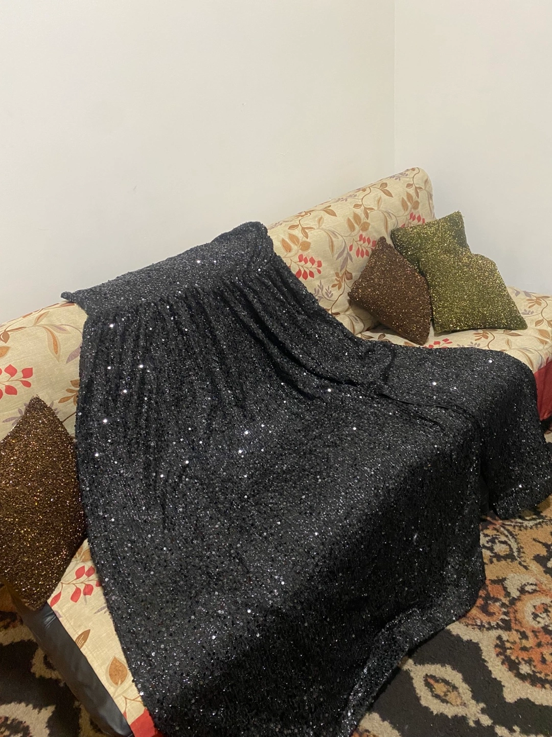 Sparkly black mini dress. One shoulder design. Sequin fabric. Great for parties or special occasions.