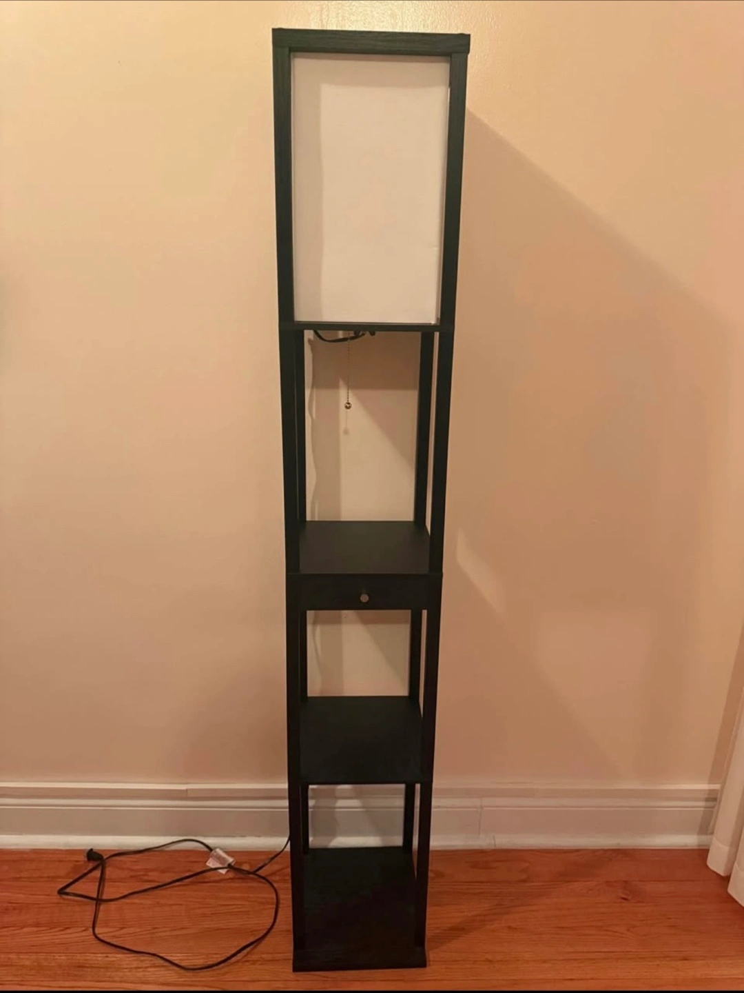 Selling a black floor lamp with built-in shelves! It's in great condition and would be perfect for adding some extra storage and light to any room. The lamp has a simple design and is easy to assemble