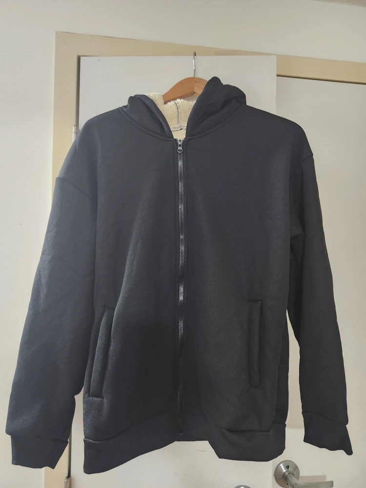 I'm selling a cozy black hoodie with a sherpa lining! It has a zipper and pockets on the front. Perfect for chilly weather!