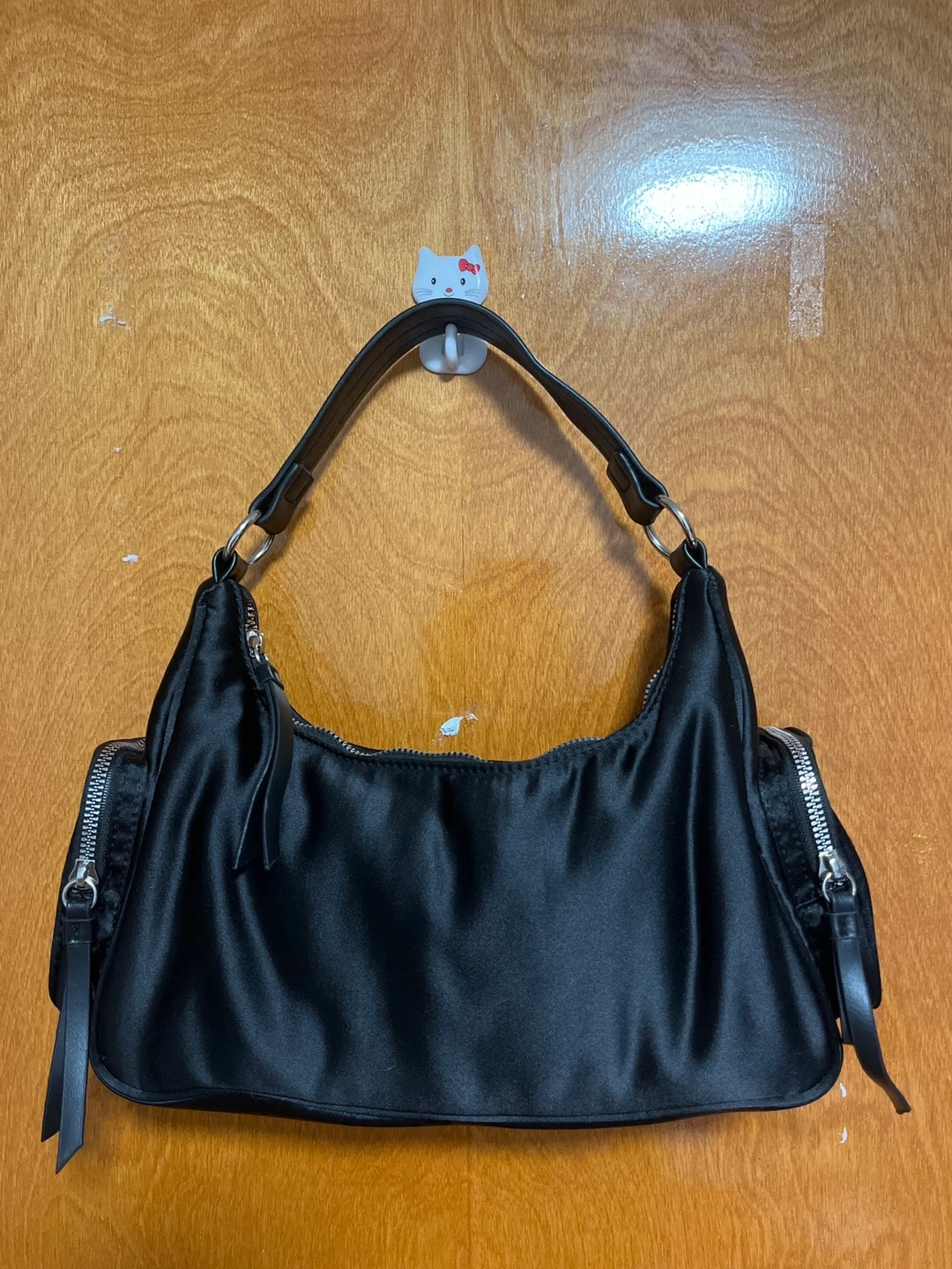 586Here's a stylish black shoulder bag! It has a sleek design with zipper details on the side pockets. The material looks smooth and the bag is in great condition. Perfect for adding a touch of elegance to your outfit! #freecycle
