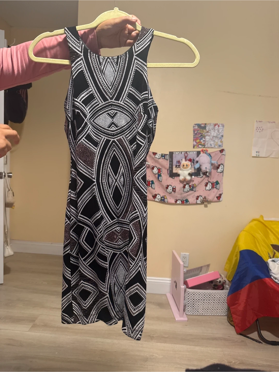 25Here's a cute dress with a unique black and silver pattern! It's in great condition and perfect for a night out or a special occasion for teen girl size 1