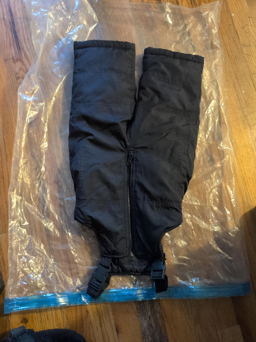 77Selling a pair of black ski leg gaiters. They appear to be in good condition and come in a plastic bag. Perfect for keeping your legs warm and dry on the slopes!.. infant one piece