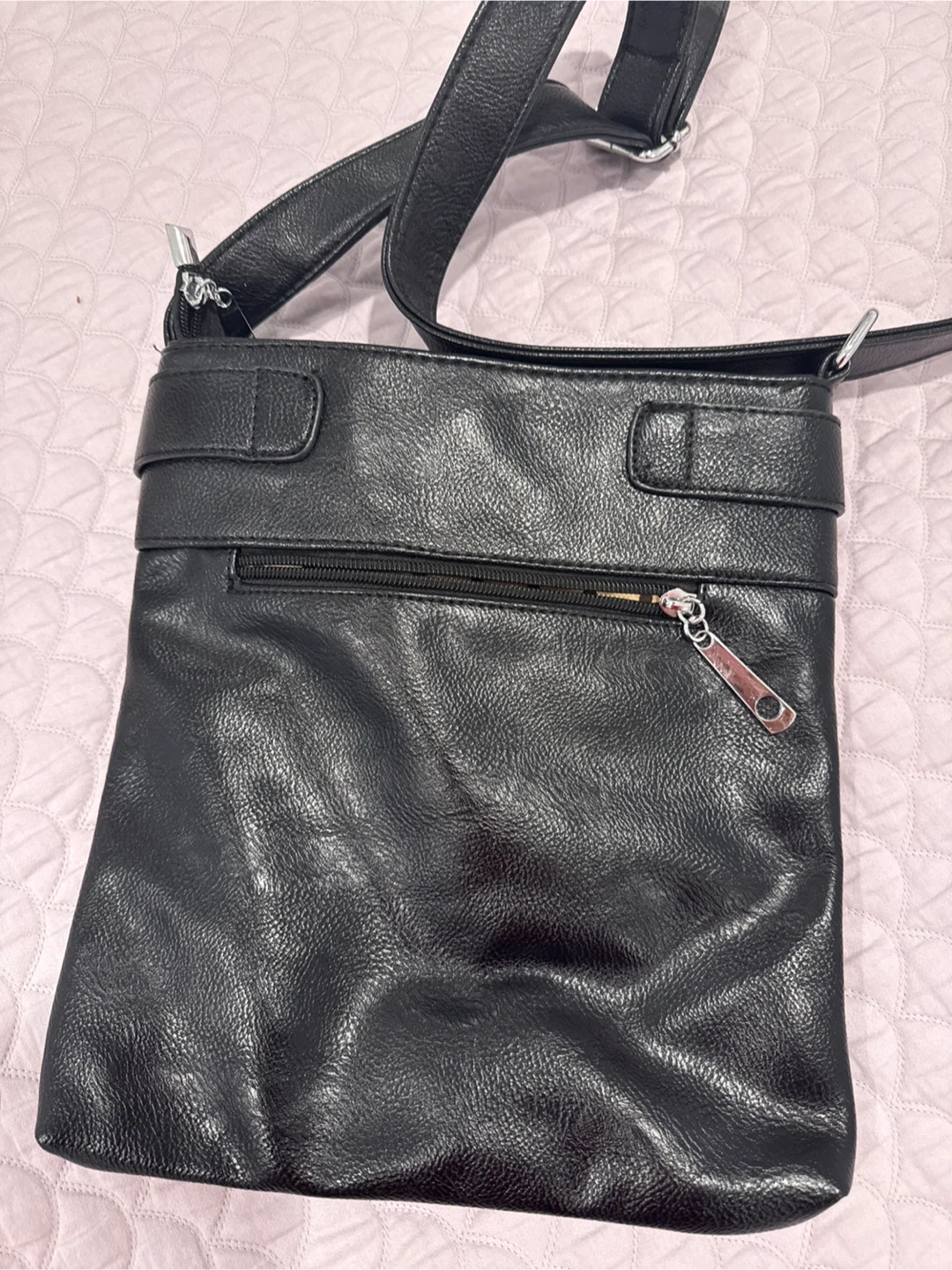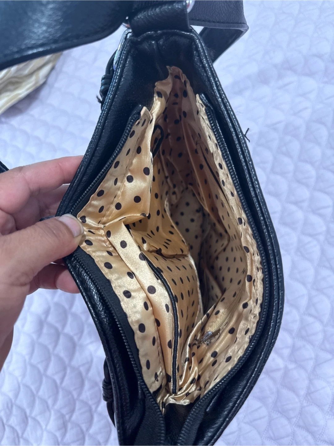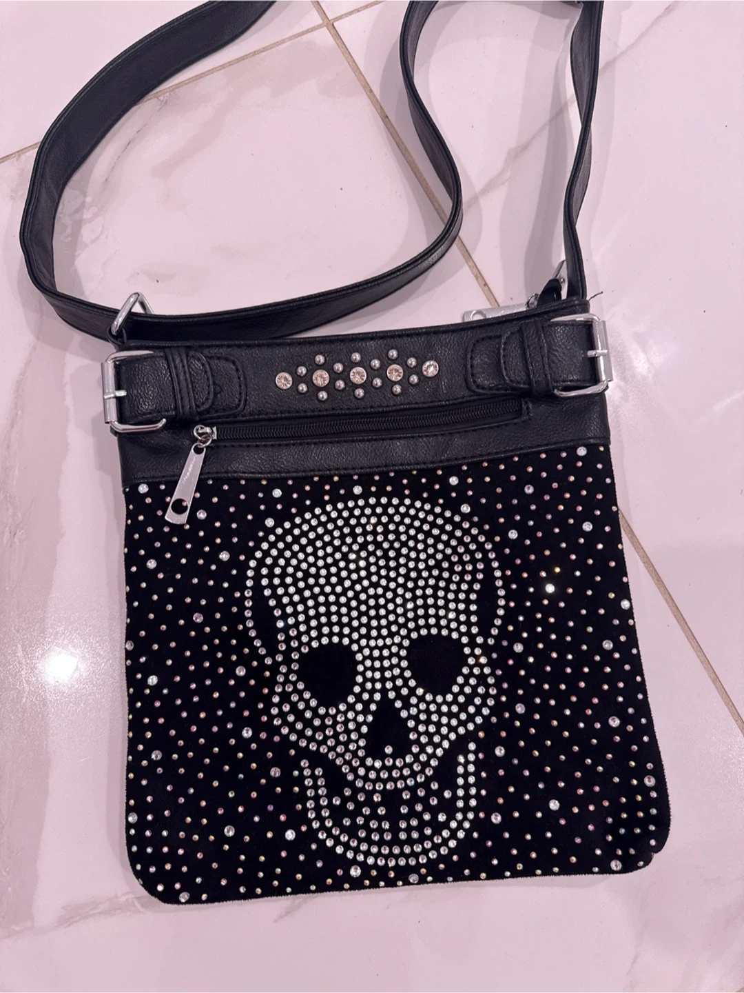 Cute black crossbody bag with a skull design made of rhinestones! It has a zipper closure and an adjustable strap. The inside has a fun polka dot lining.