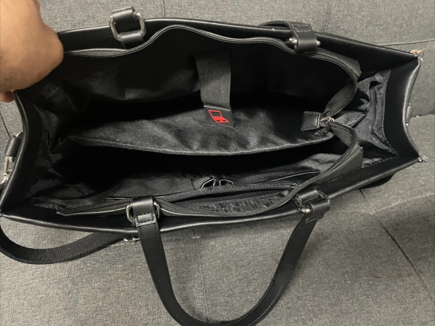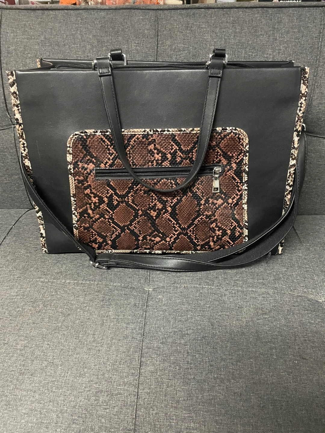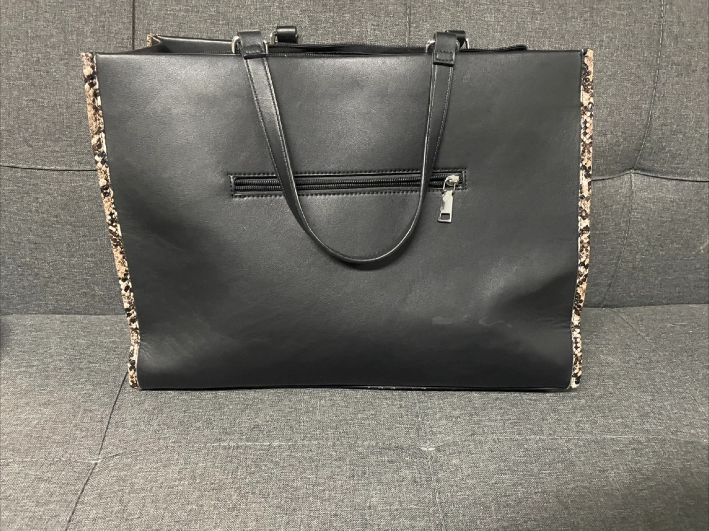 Large black tote bag. Snakeskin print detail. Two top handles and a removable shoulder strap. Multiple interior pockets. Zipper closure.