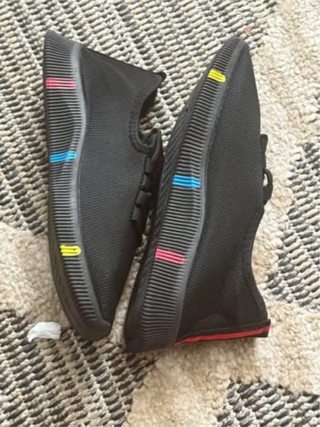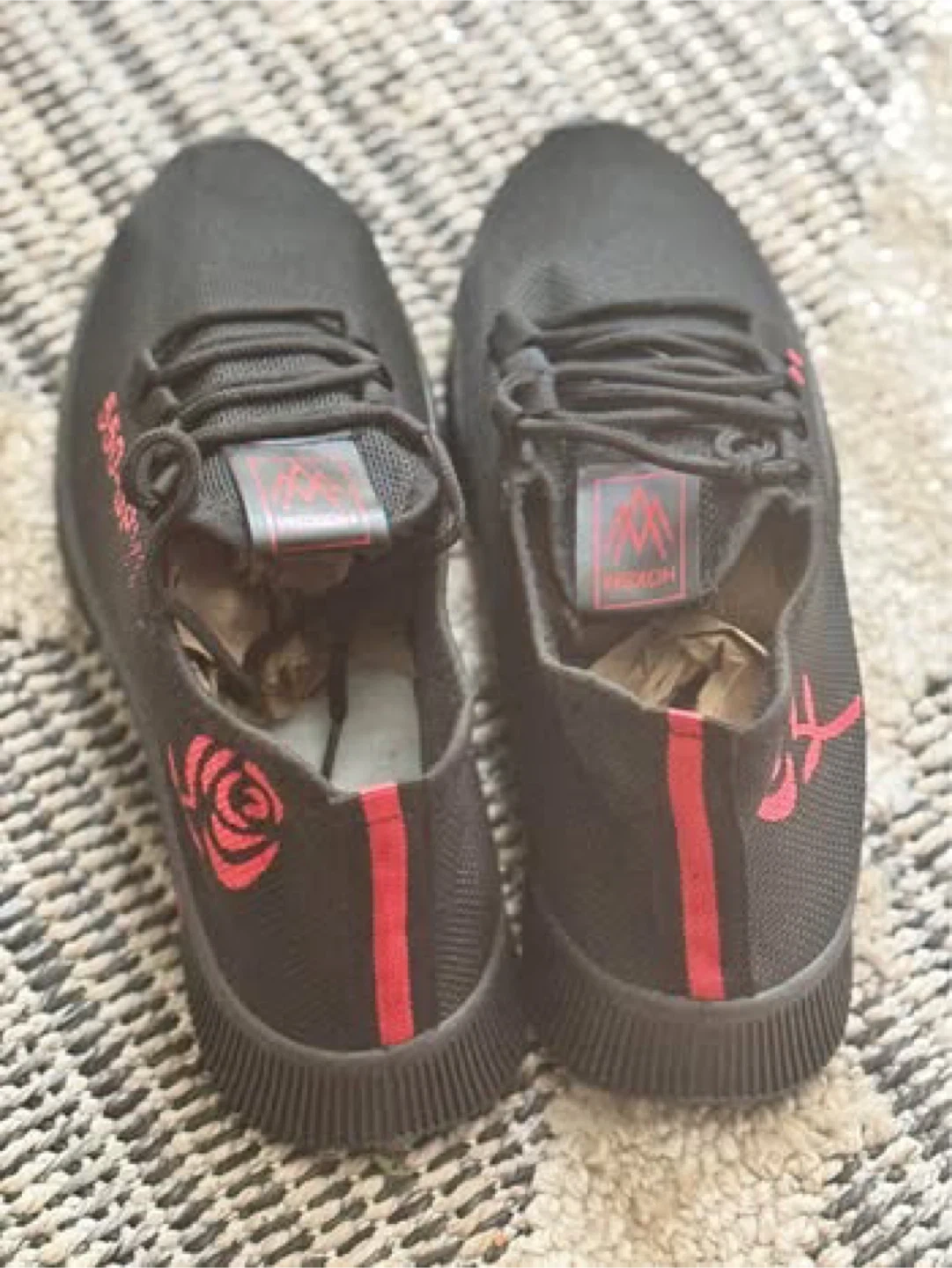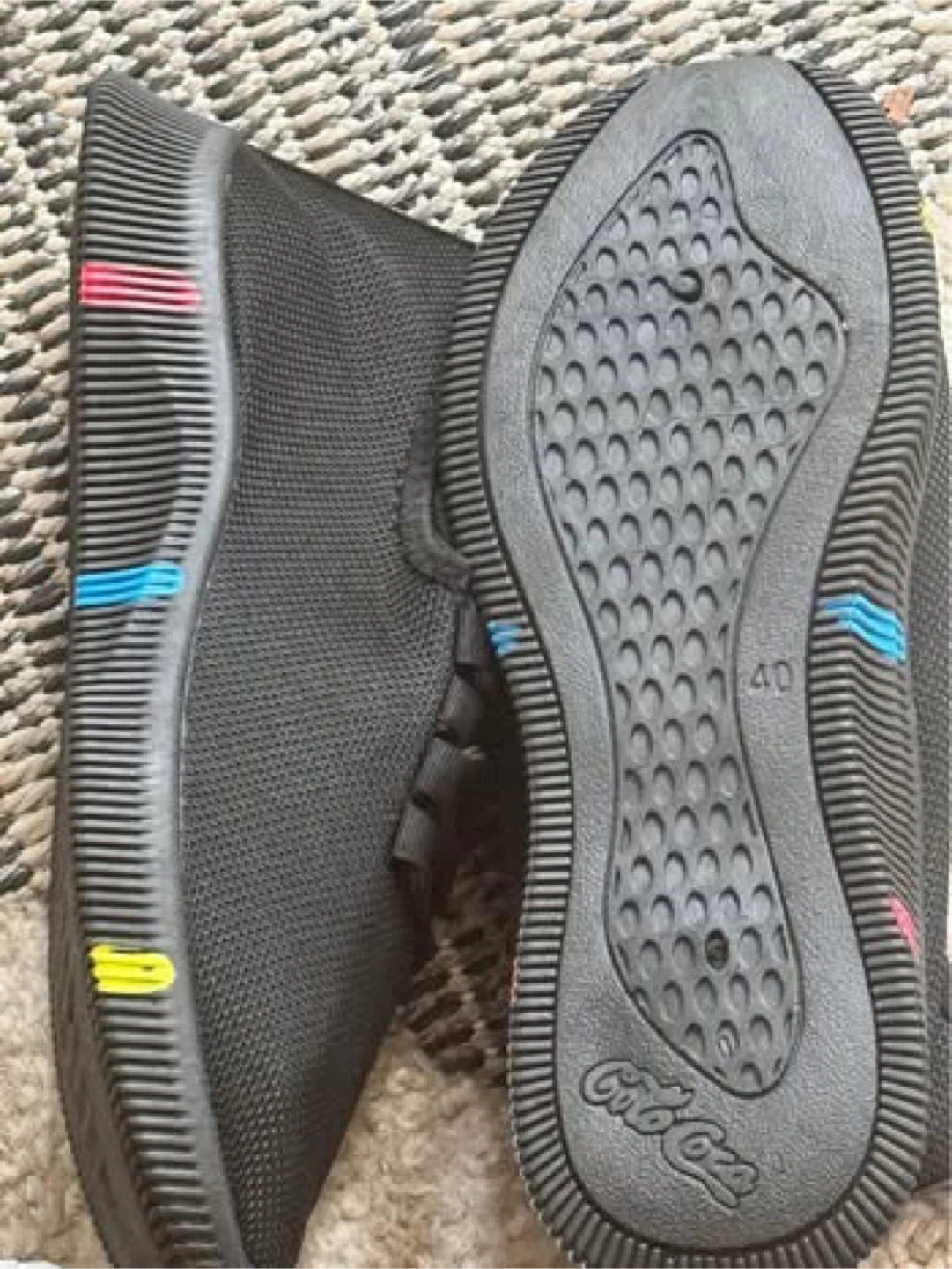 103Selling a pair of black sneakers in EU size 40. They have a unique design with colorful accents on the sole and a rose design on the side. Great for everyday wear!