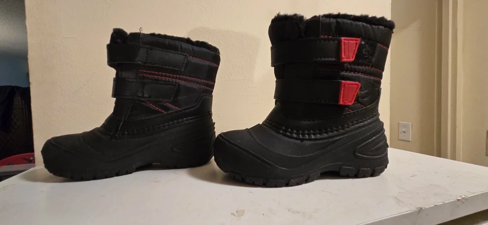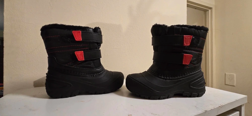 10Selling a pair of black snow boots in good condition. They feature red accents and a velcro strap closure. The size is a US 9.