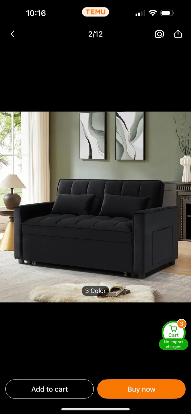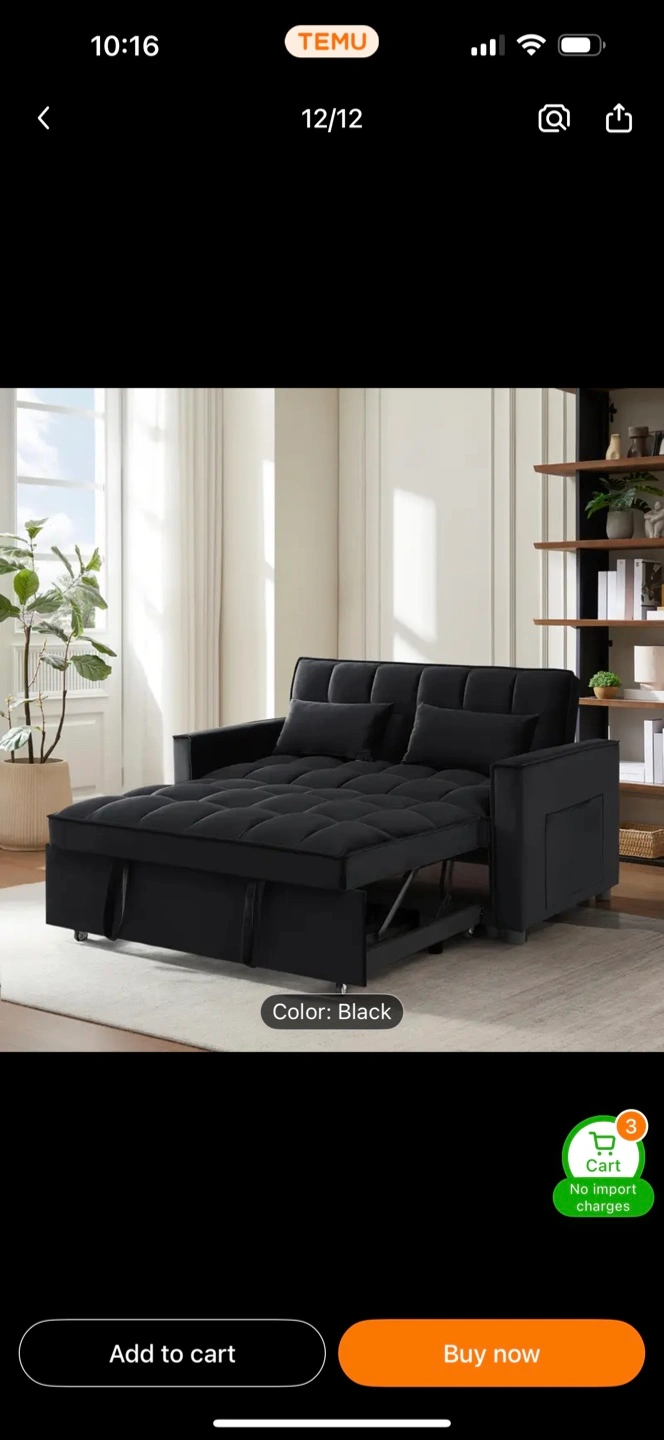 I'm selling a black sofa bed. It's a stylish and functional piece of furniture that can easily convert into a bed for guests or for lounging. The color is black and looks great in any living space