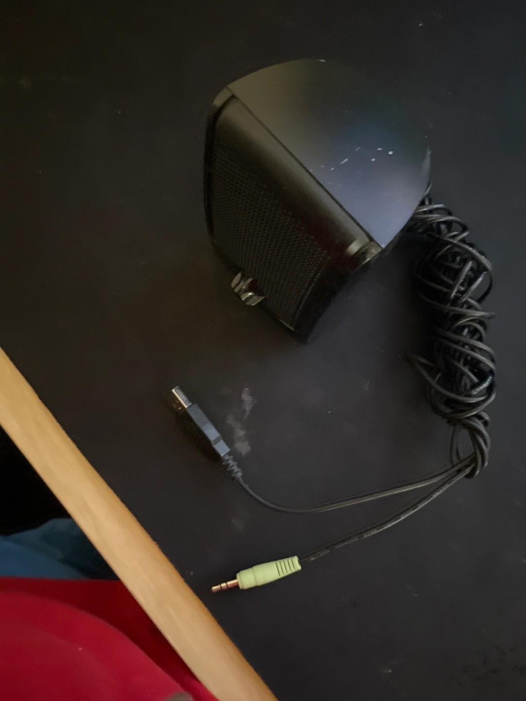 24Selling a black speaker. It has a USB connector and a 3.5mm audio jack. It's in good condition! The wire is rapped up you can entrap it when you get it.