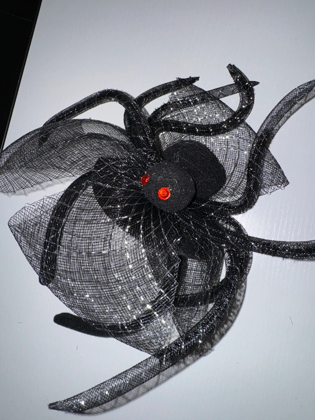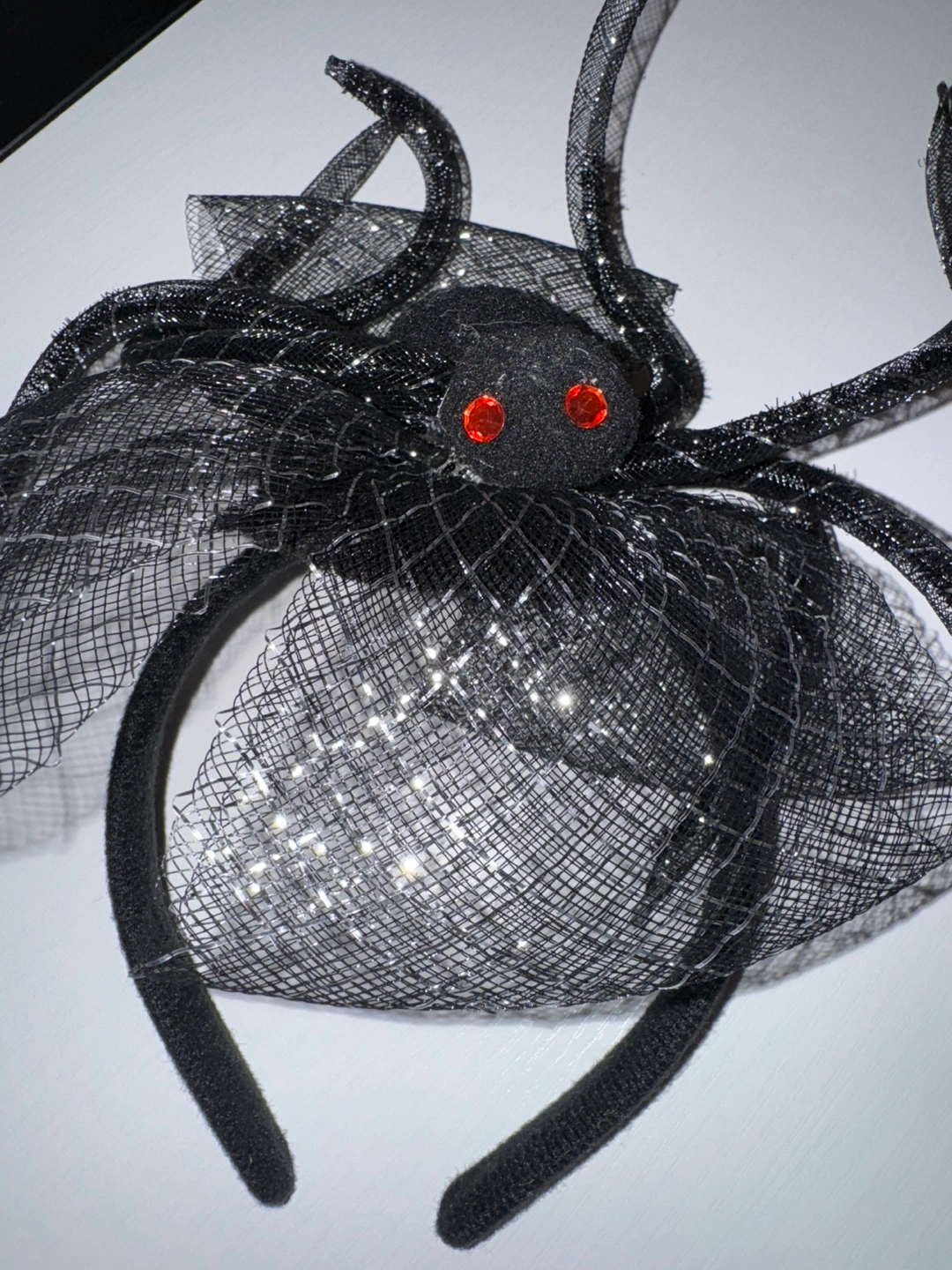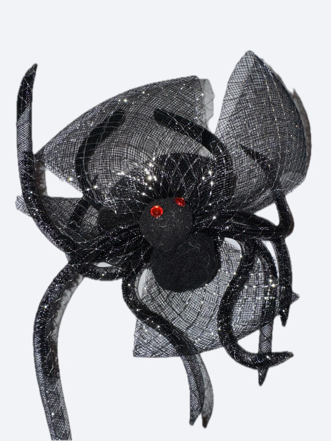 Black velvet headband. Features a black spider with red eyes. Spider sits atop a black sparkly mesh bow. Great for Halloween costumes or parties.