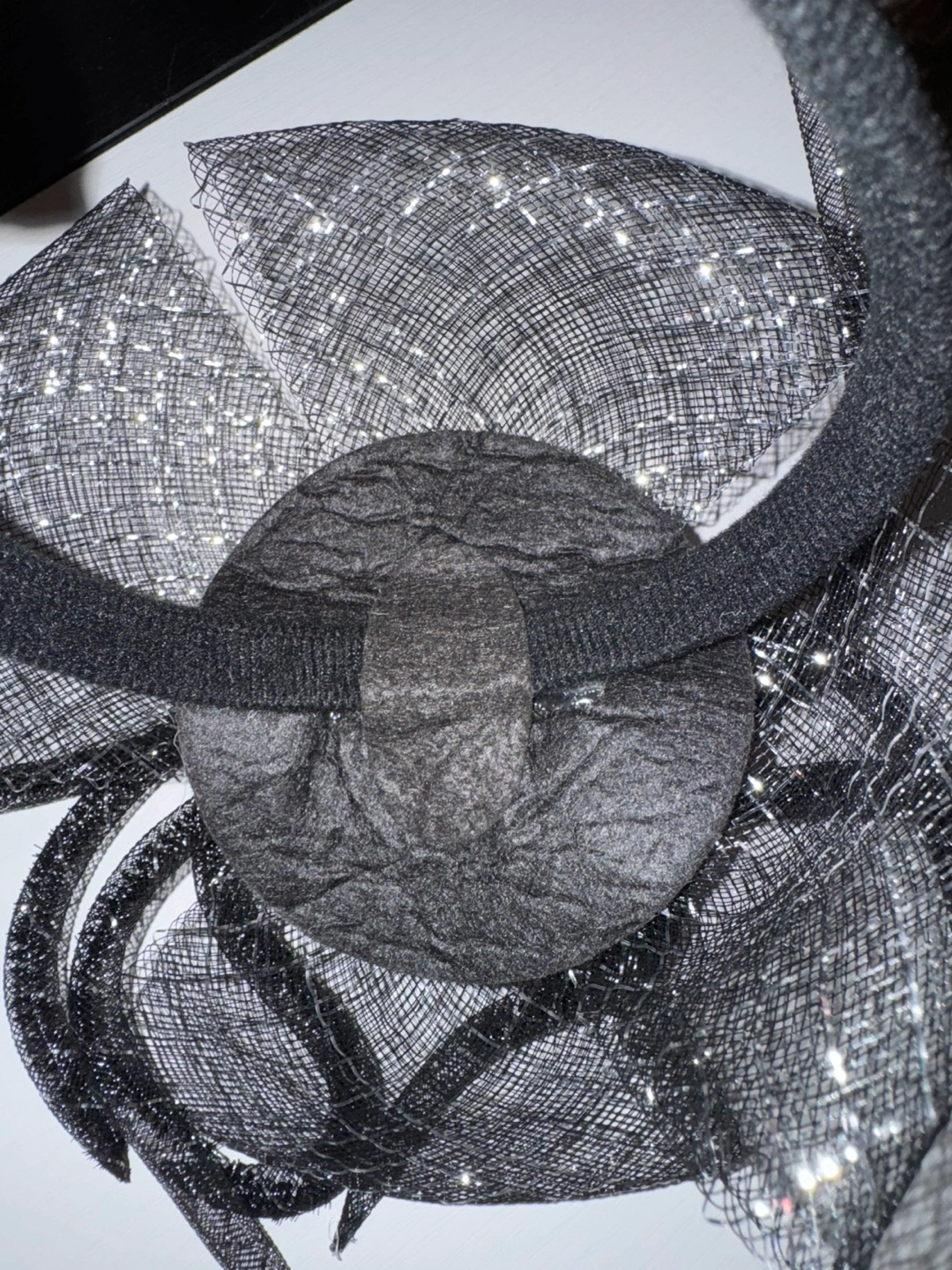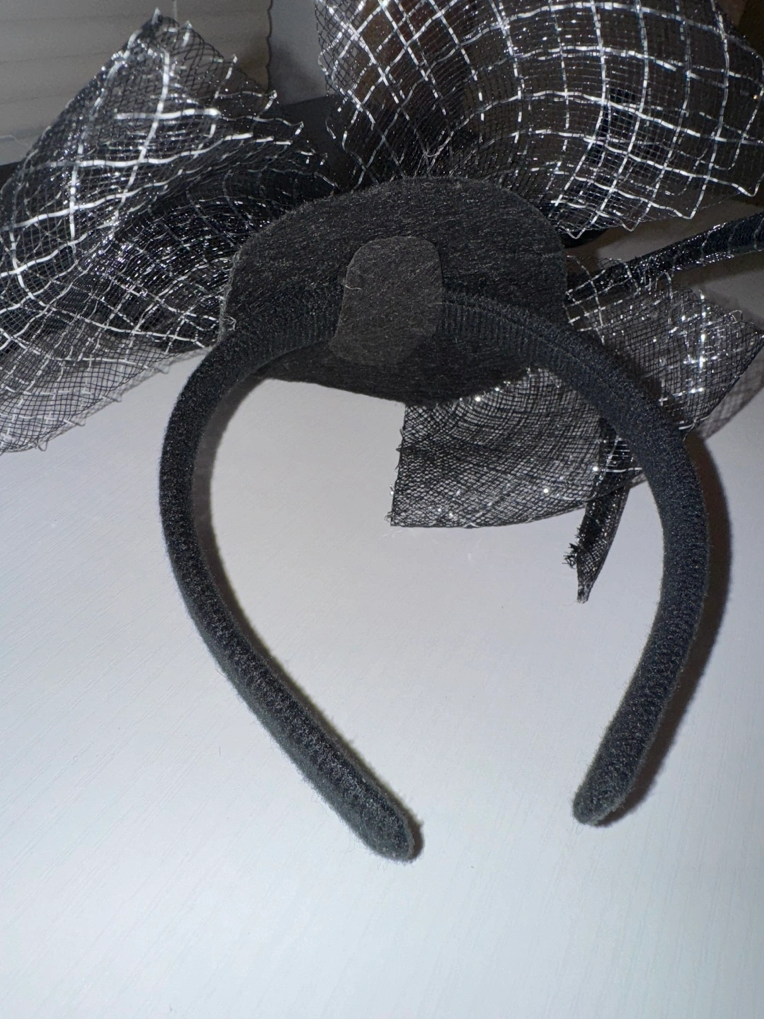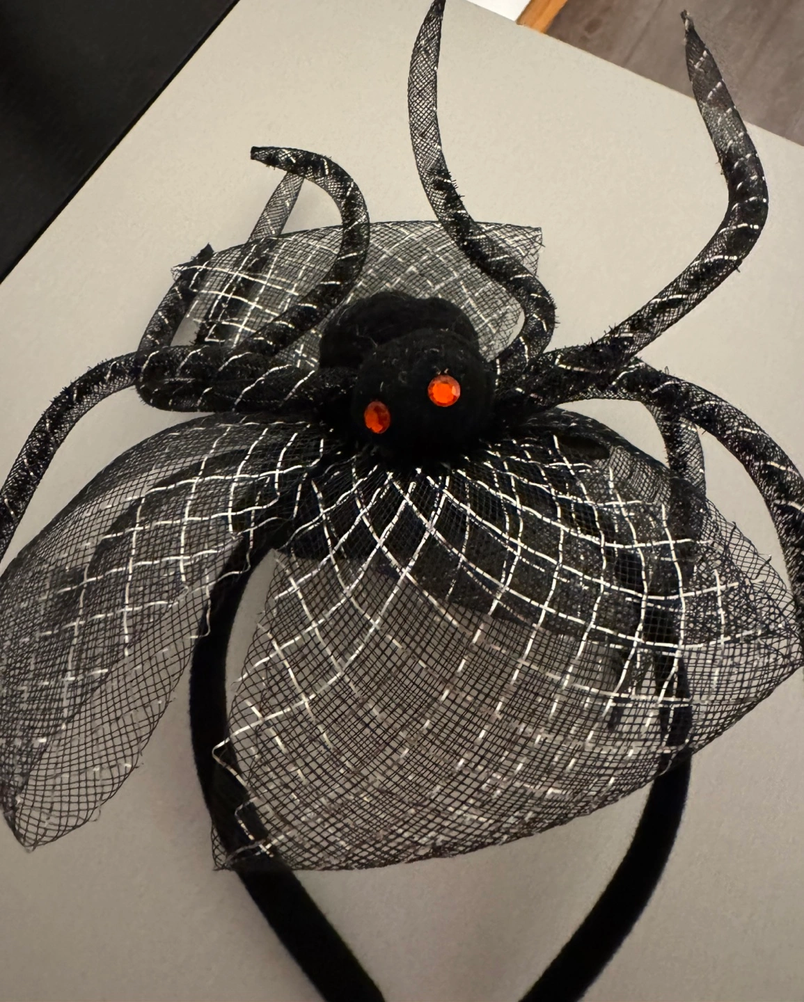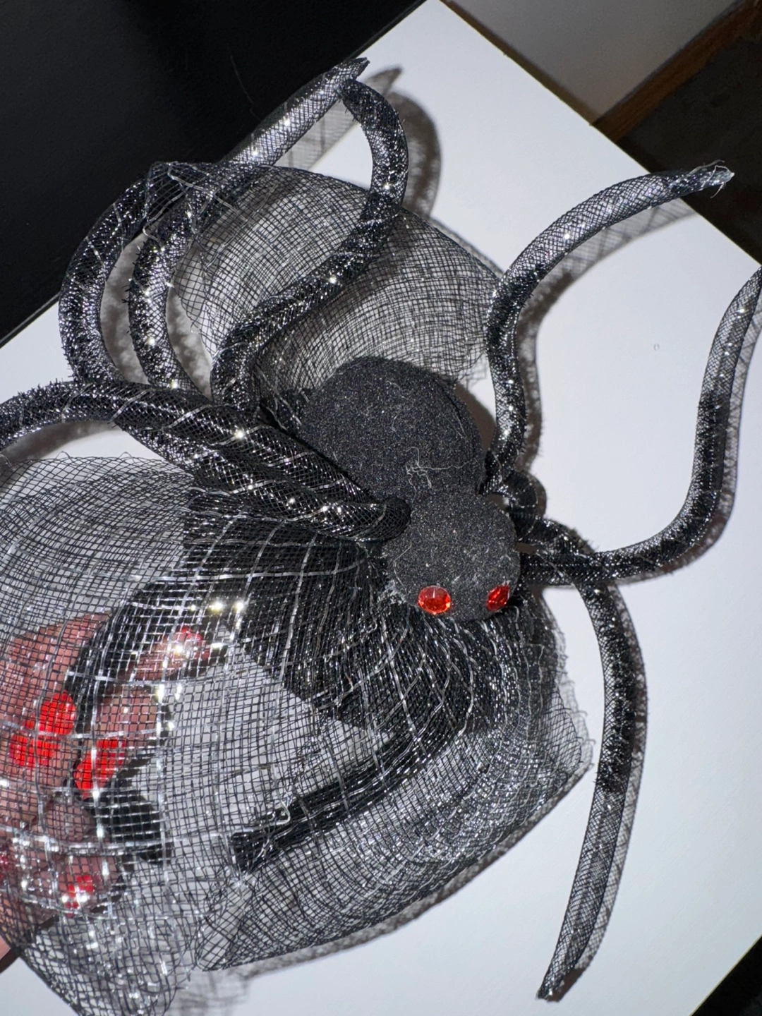 Black velvet headband. Features a black spider with red eyes. Spider sits atop a black sparkly mesh bow. Great for Halloween costumes or parties.