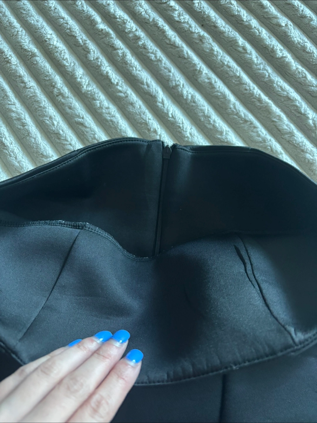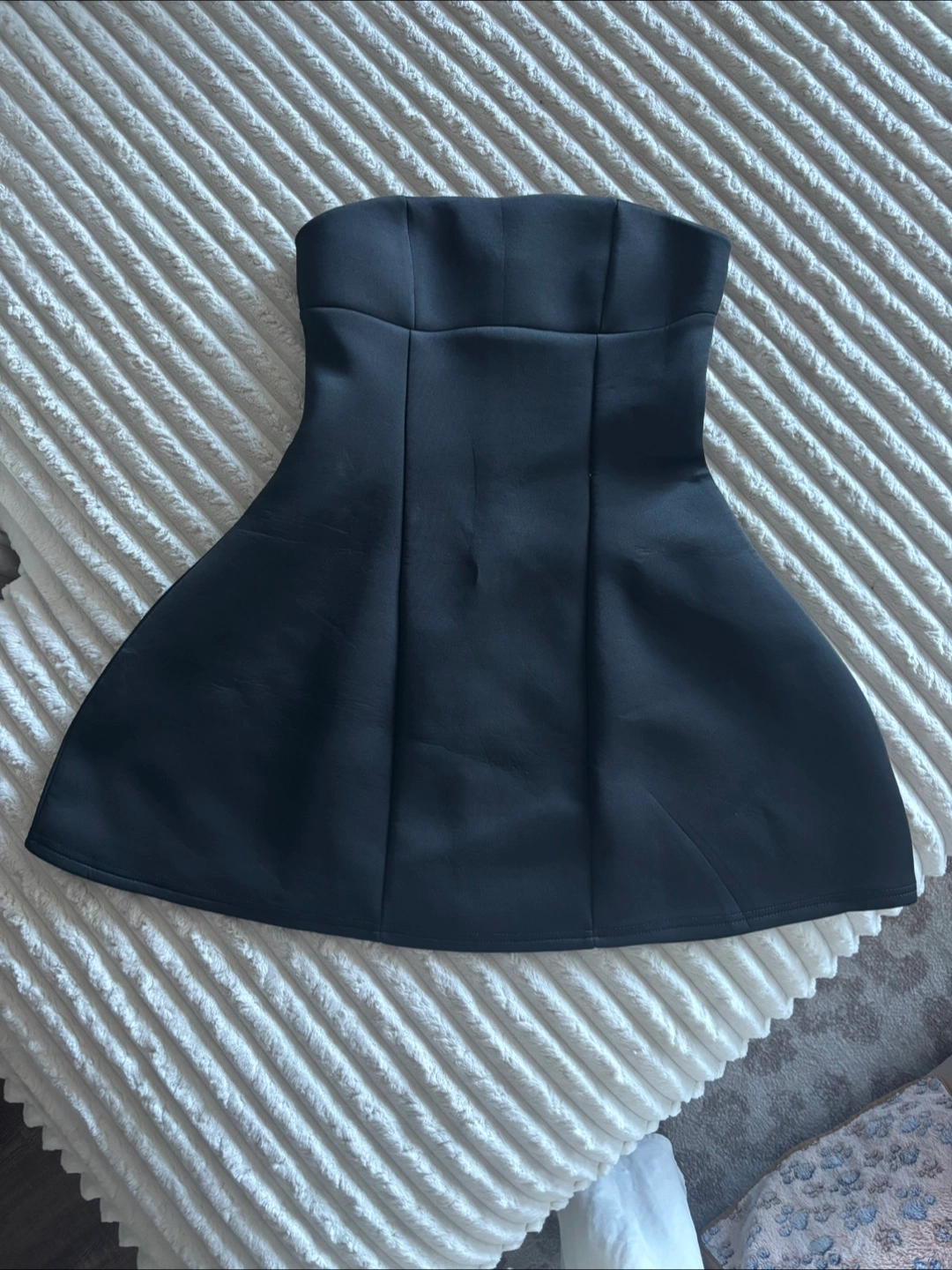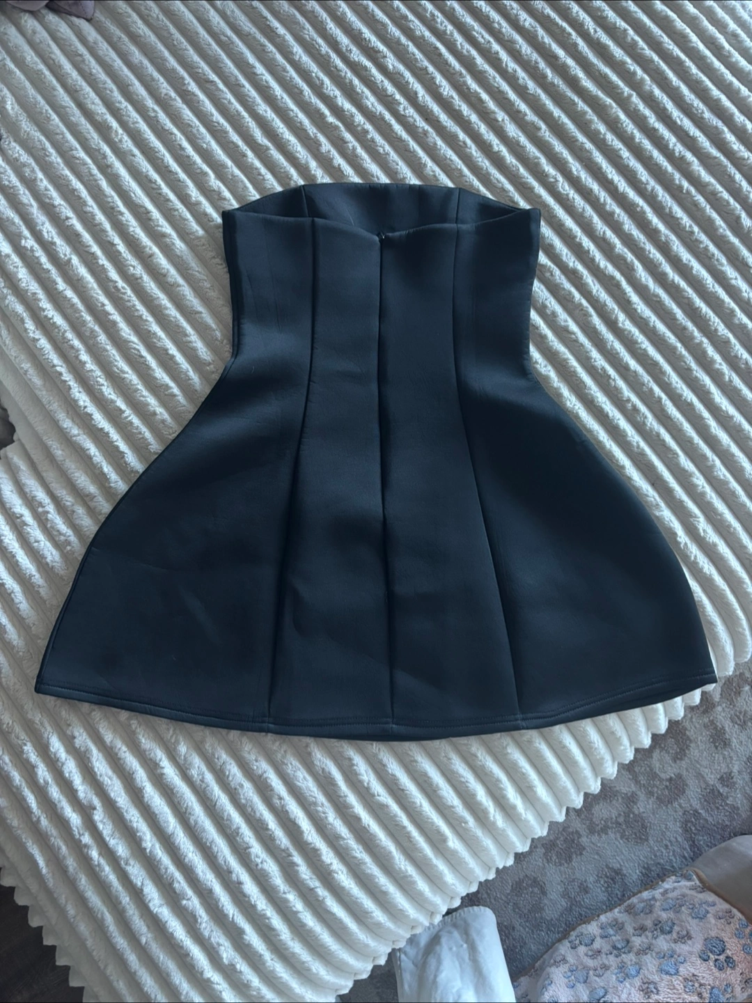 Mini black dress. Strapless neckline. Back zipper. Great for a party, dinner, or night out. Only worn once but it was too big in the chest area for me! Fabric is very smooth. Not sure on the size since there is no tag but I am usually an XS.