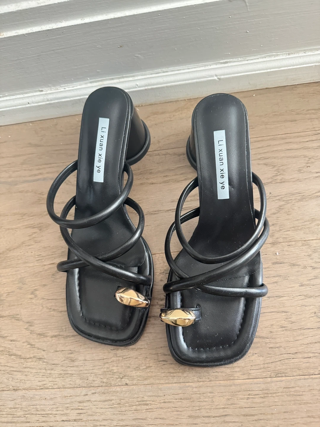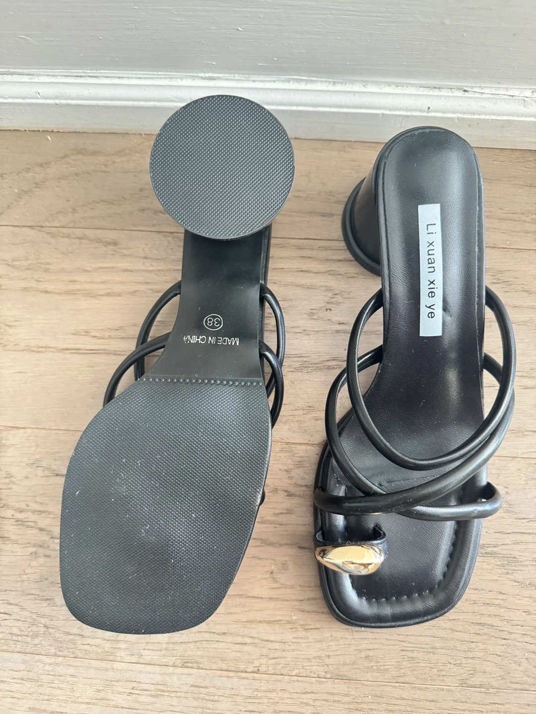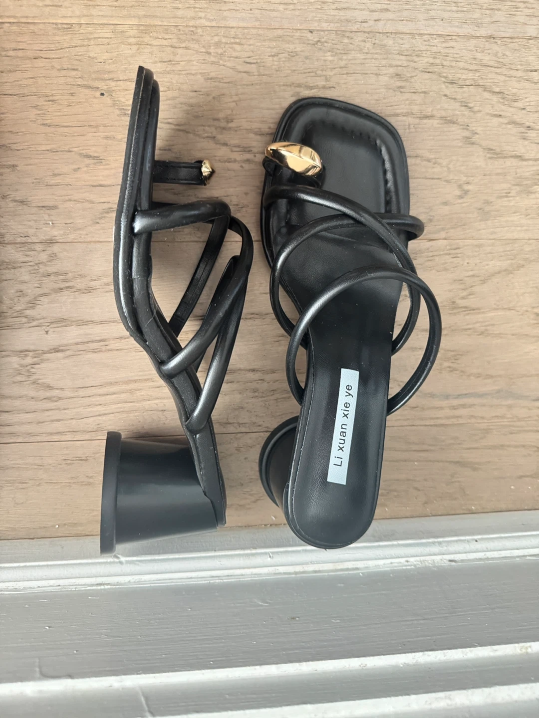 Show allBlack Strappy Heels / sandals with Gold Ring | Size 38 7.5