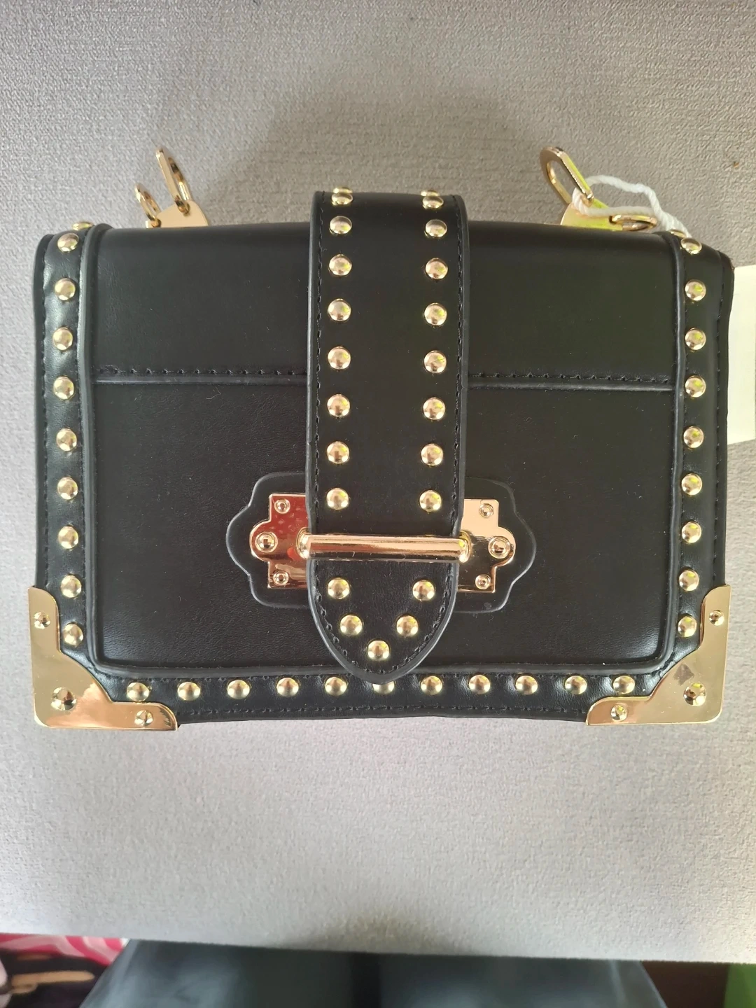 60This is a stylish black crossbody bag with gold stud detailing. It has a unique trunk-like design with gold accents on the corners and a secure clasp. Perfect for adding a touch of edgy elegance to any outfit!