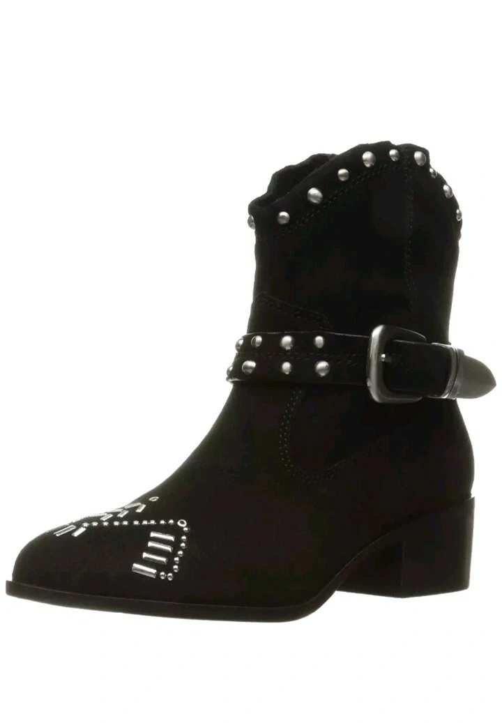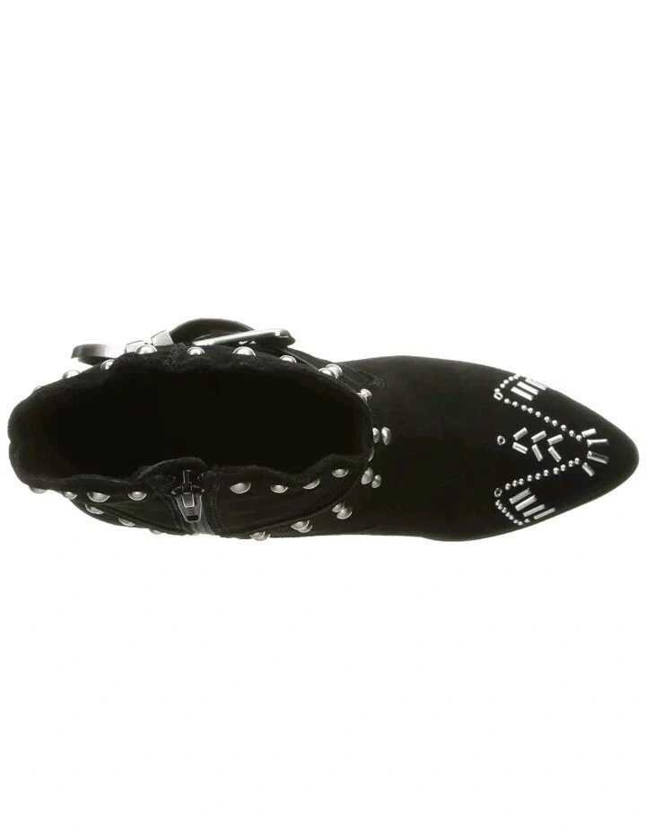 1000+Black suede ankle boots. Decorative studs along the top of the boot and on the strap. Feature a side zipper and silver embellishments on the toe area. A great way to complete an outfit for a fun night out.