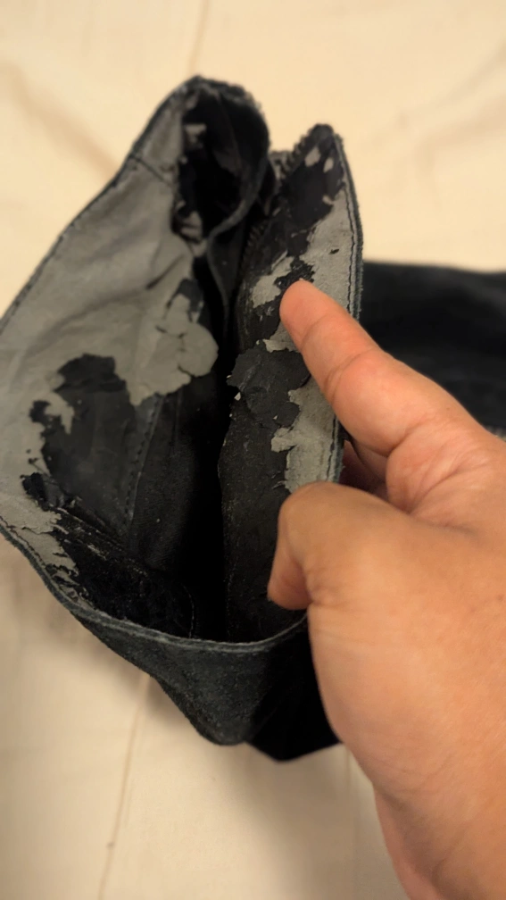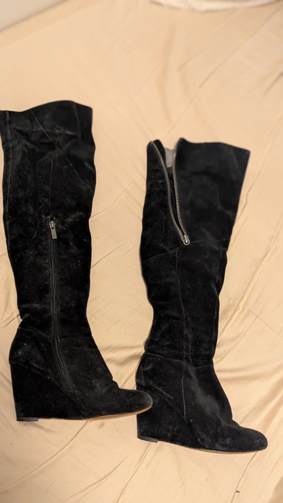 Selling a pair of black suede thigh-high wedge boots. They have zippers on the sides. There is some peeling on the inner lining but this doesn't affect functionality at all. And this is not visible once you wear it. Please see the photos.