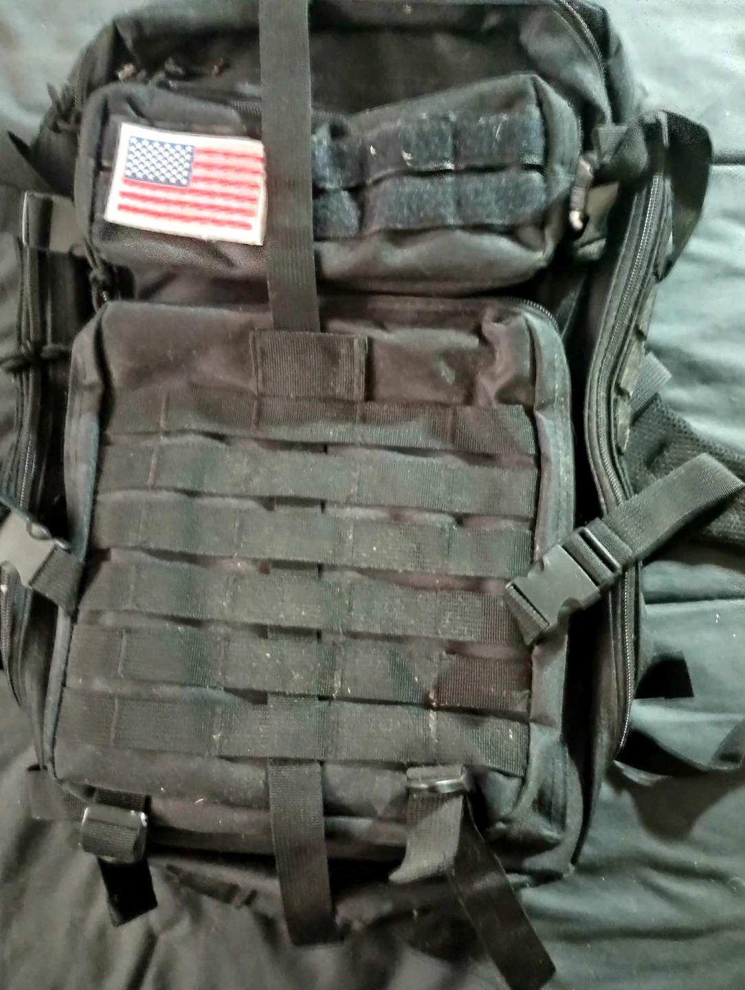 70Selling a black tactical backpack. It features a prominent USA flag patch and lots of modular webbing for attaching extra gear. It's in good condition and ready for your next adventure