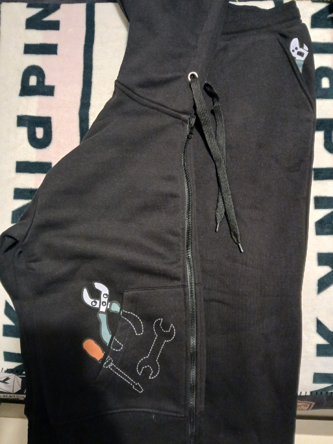 Selling a black zip-up hoodie. It features a unique design with tool graphics on the pockets. It's in great condition and ready for a new home!