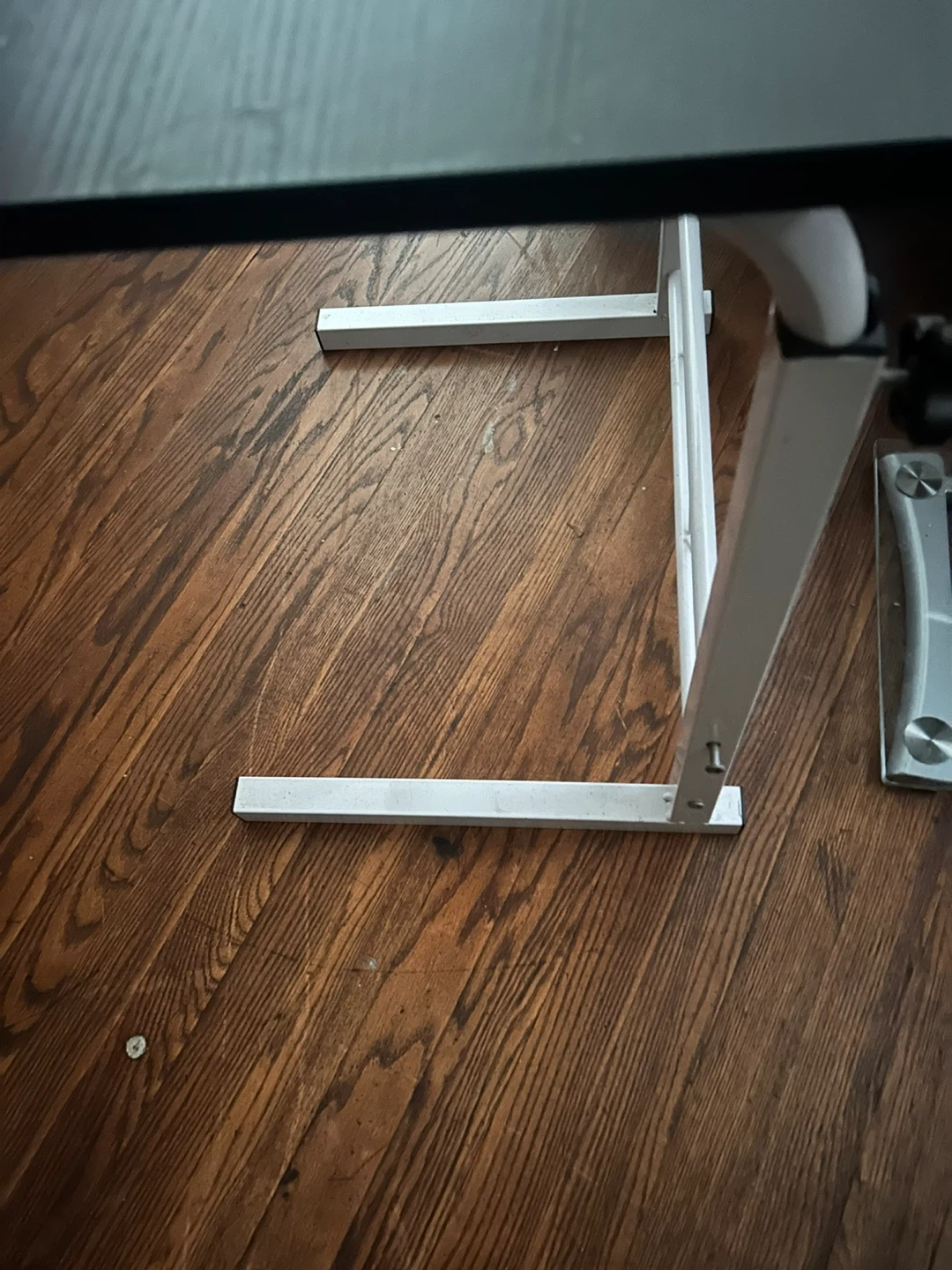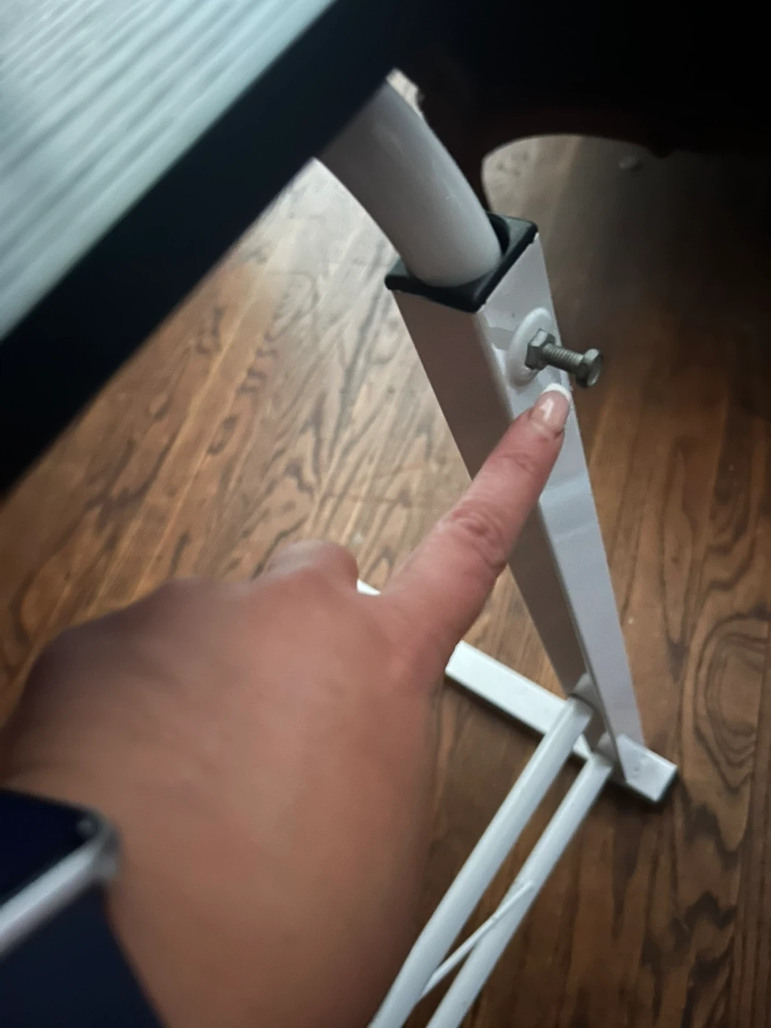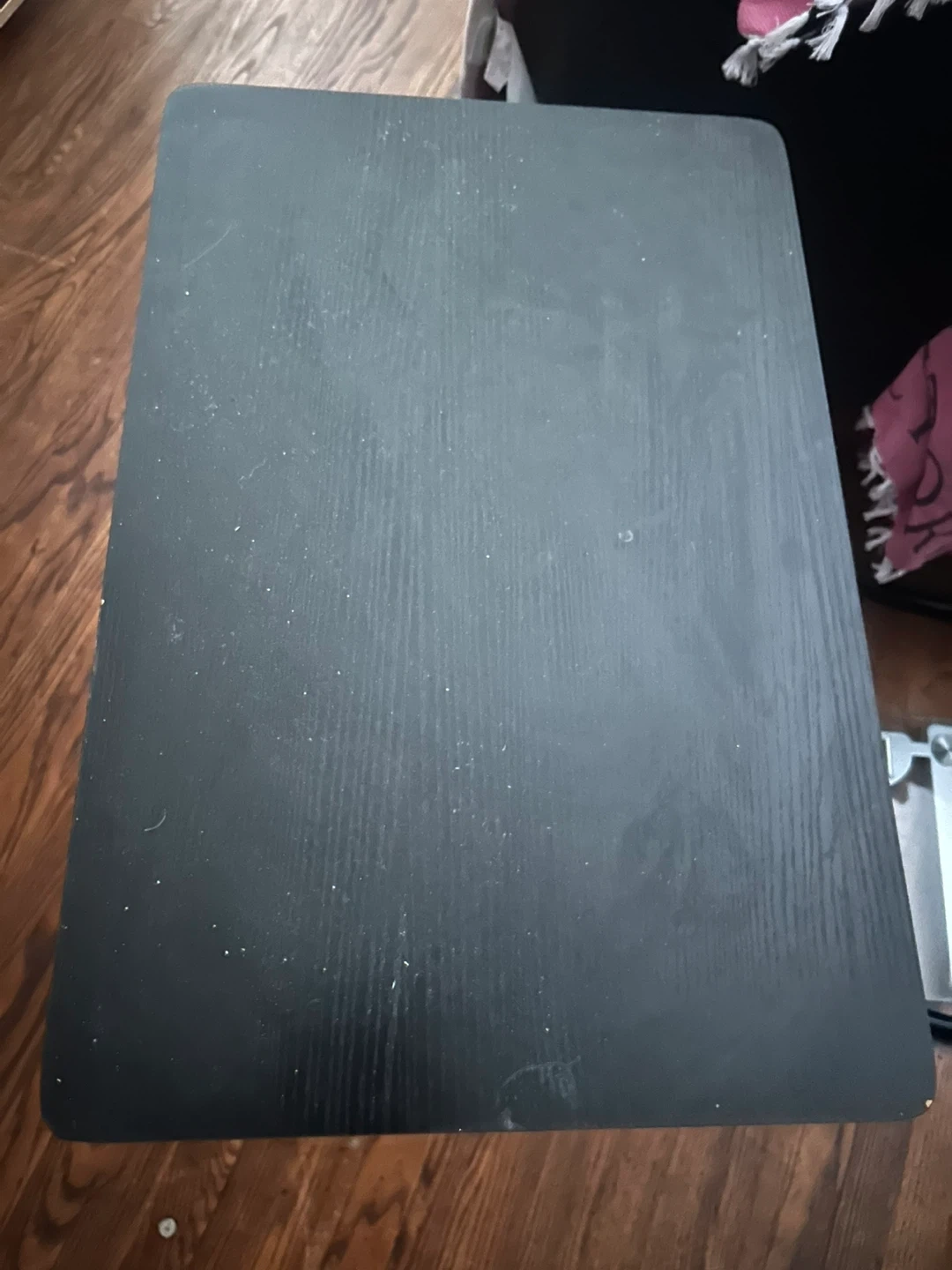 Selling a simple side table with a black top and white legs. It's in good condition and perfect for small spaces one knob is missing as shown in picture Used it for my printing label machine Has a bit of a squeaking sound when moving