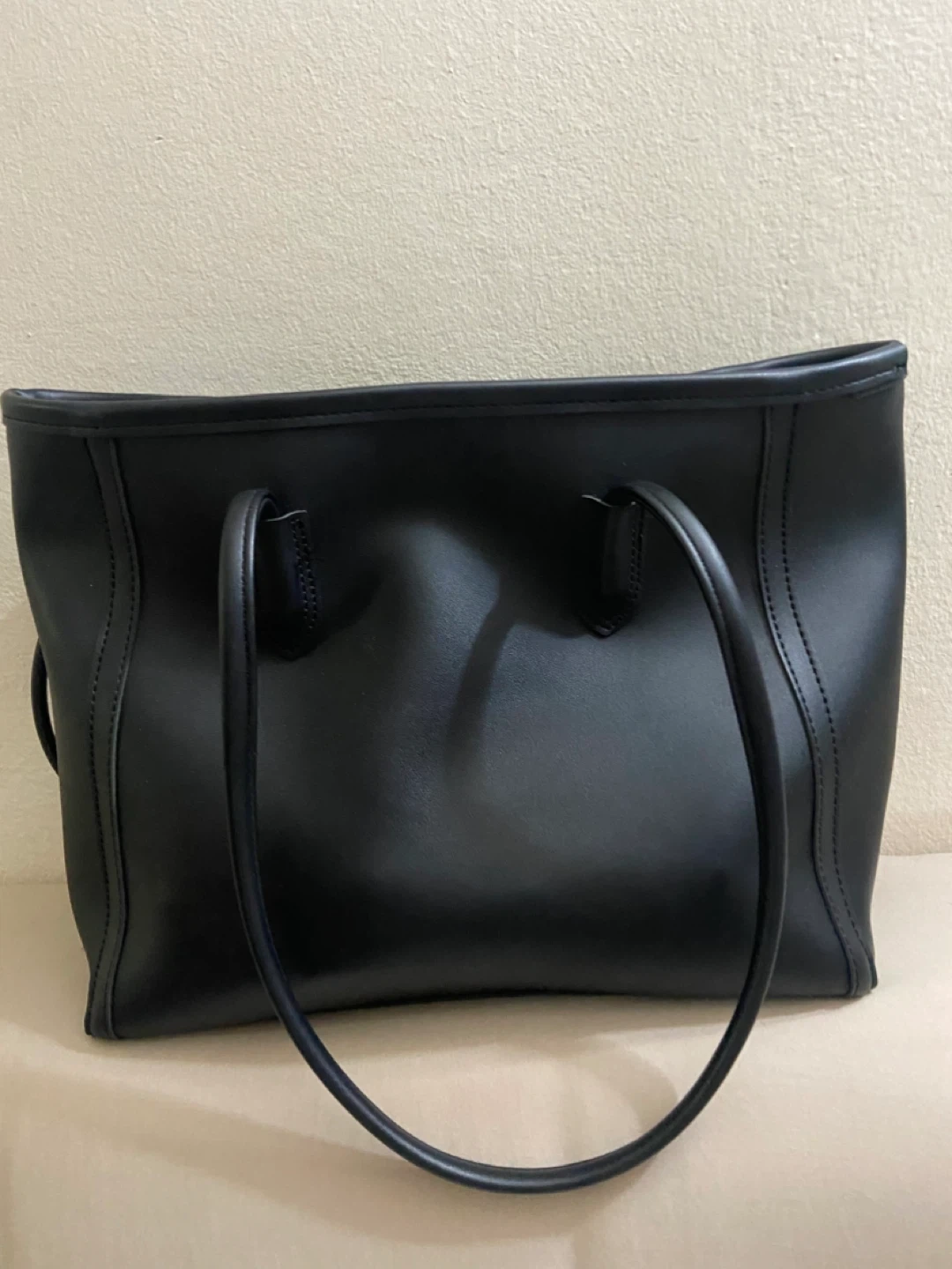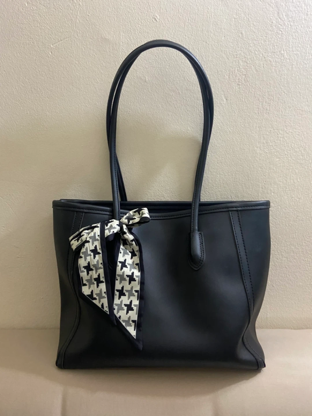 10Selling a stylish black tote bag! It's in great condition and perfect for everyday use. The bag features a sleek design and comes with a cute patterned scarf tied to the handle, adding a touch of elegance