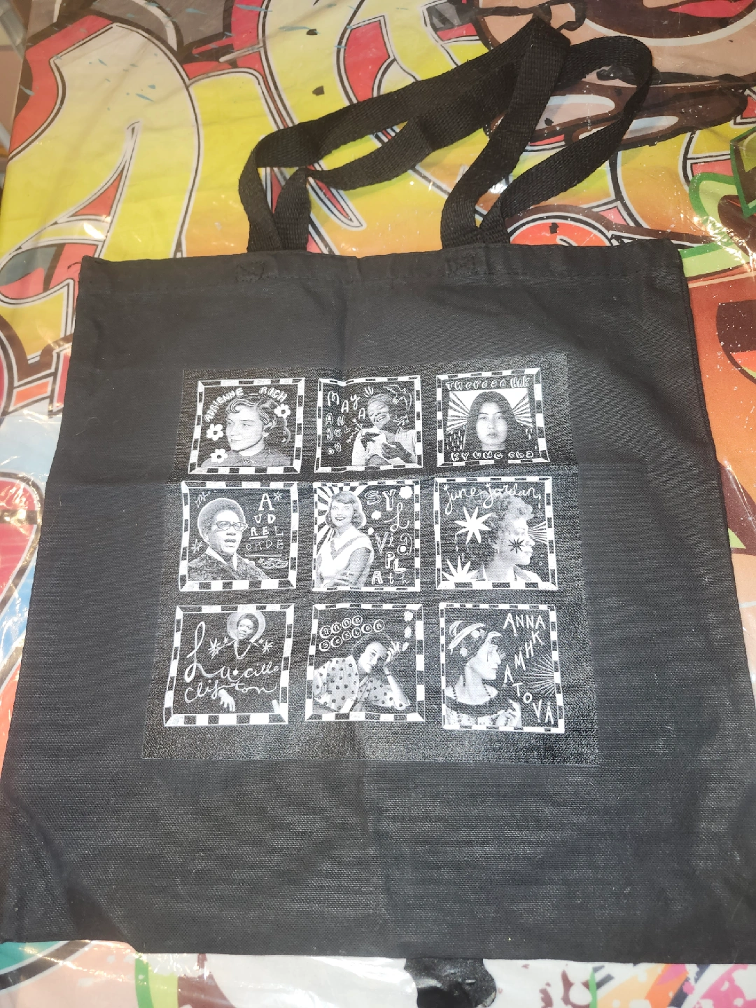 101This is a black tote bag featuring portraits of various women. It's perfect for carrying your everyday essentials while showing off a bit of style. The bag is in good condition and ready for a new home!