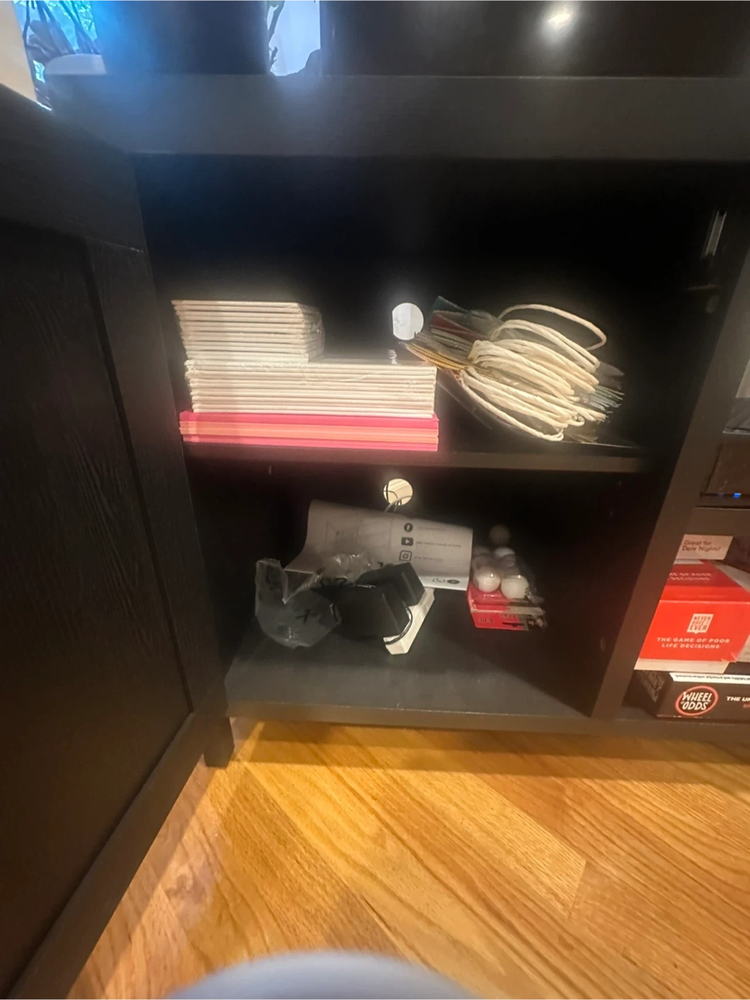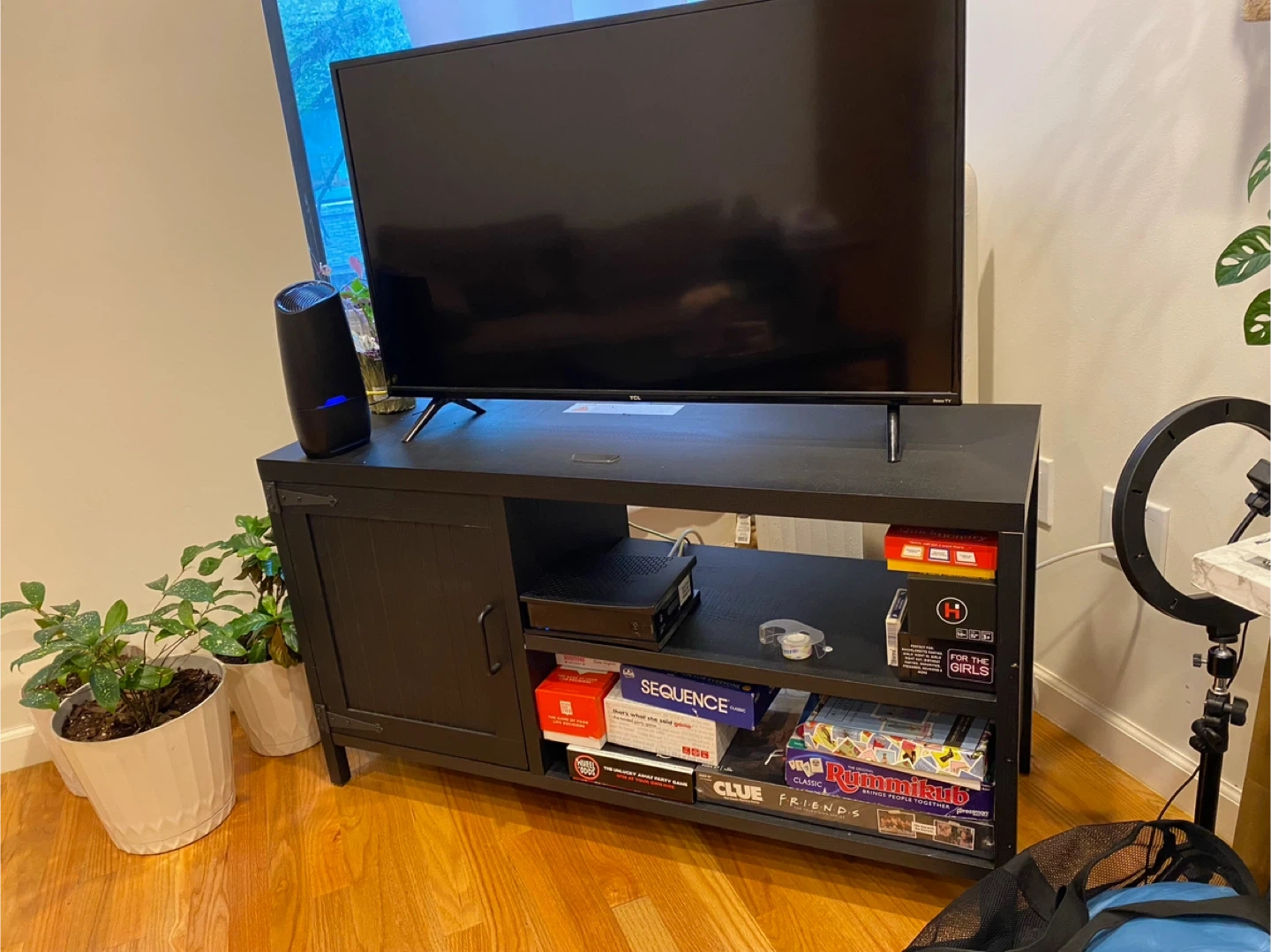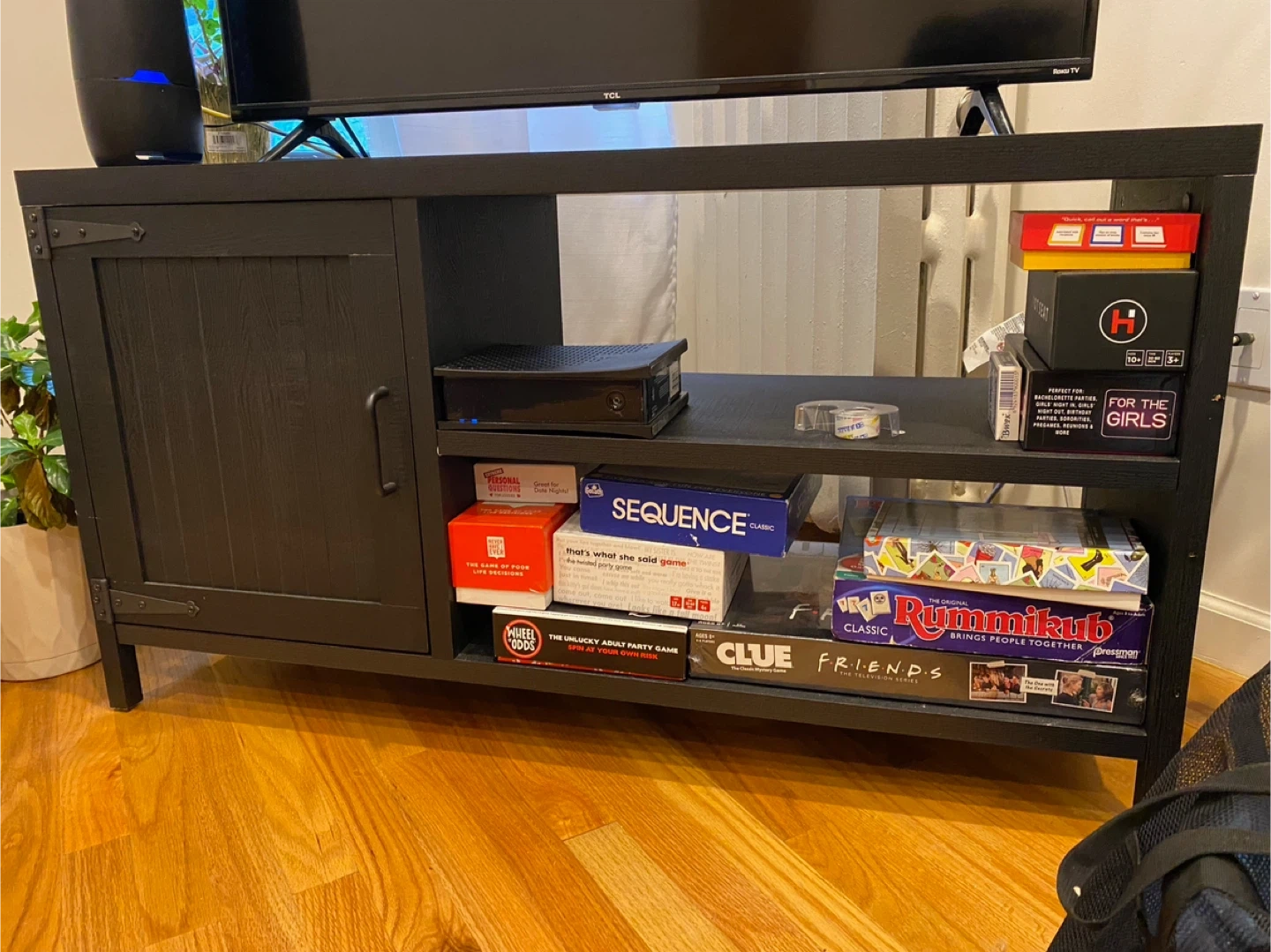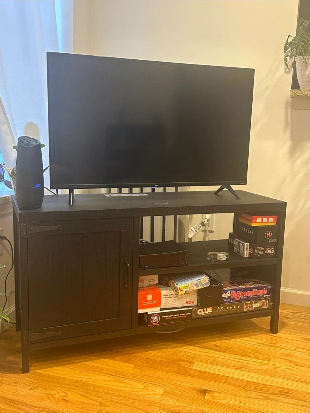 167Selling a black TV stand/media console. It has a cabinet on one side and open shelving on the other. Great for storing games, consoles, or other media devices! Used less than one year. In great condition. Pick up in Astoria.