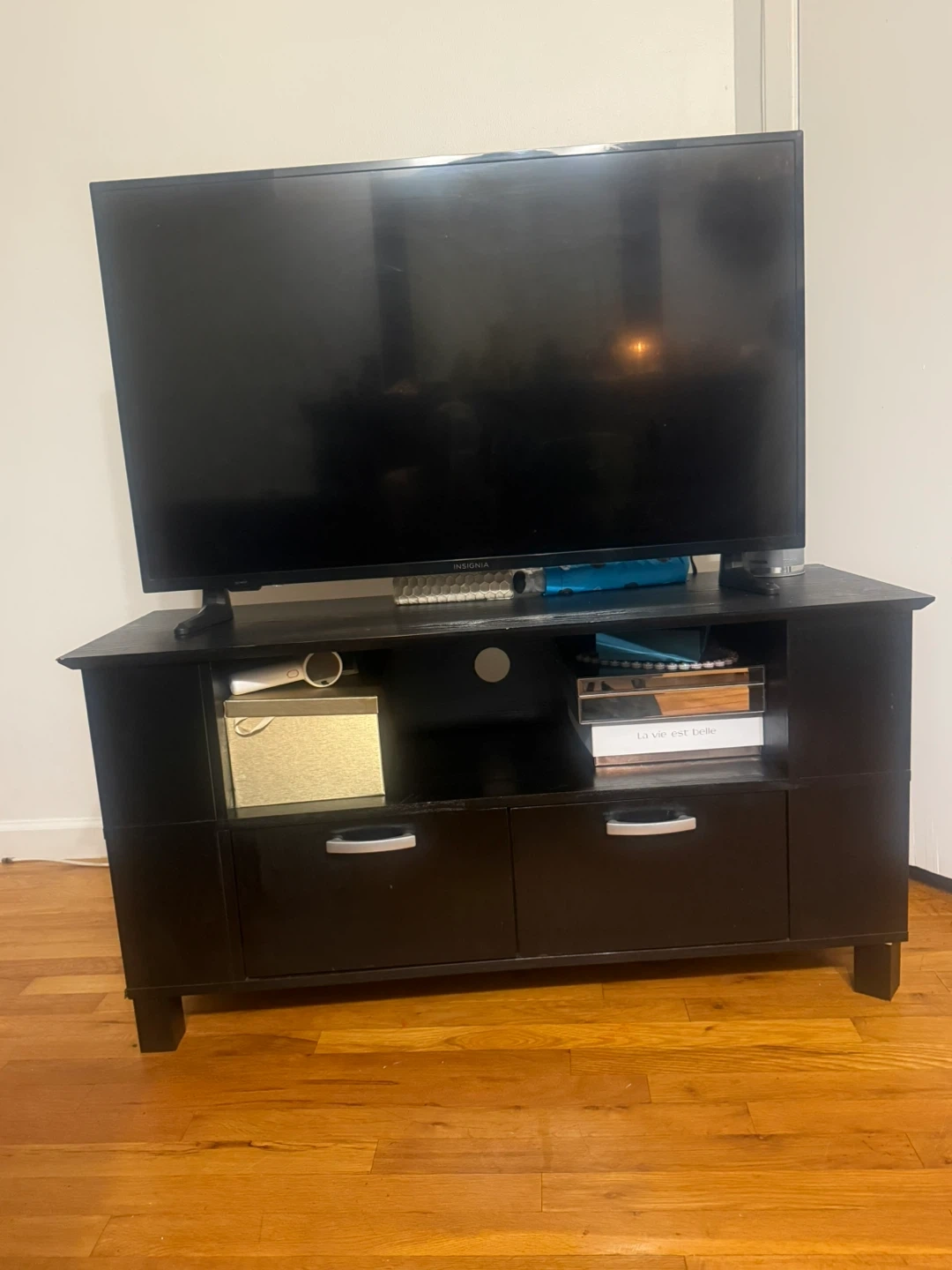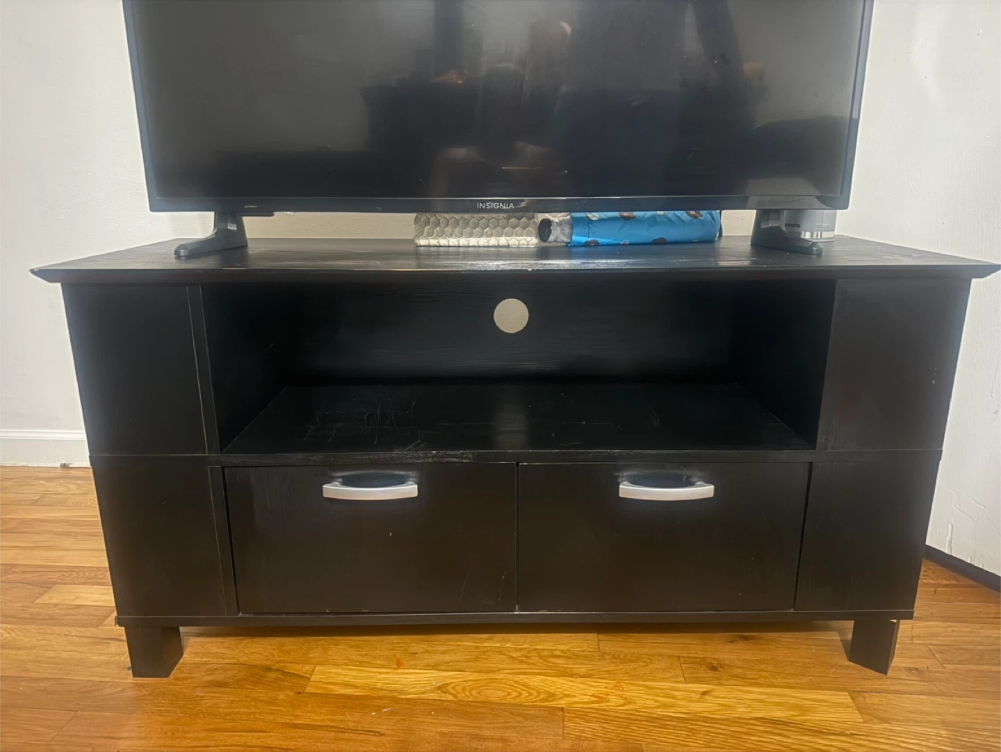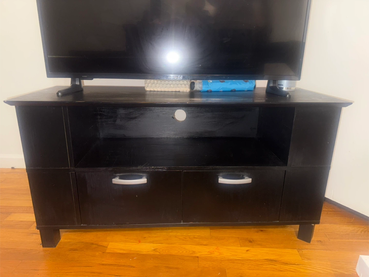 Selling a black TV stand with drawers. It has some signs of use, but is in overall good condition. It features an open shelf and two drawers for storage