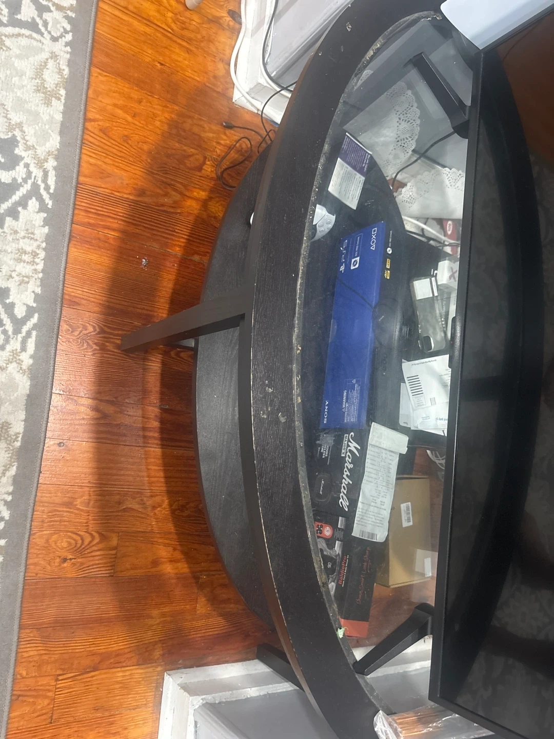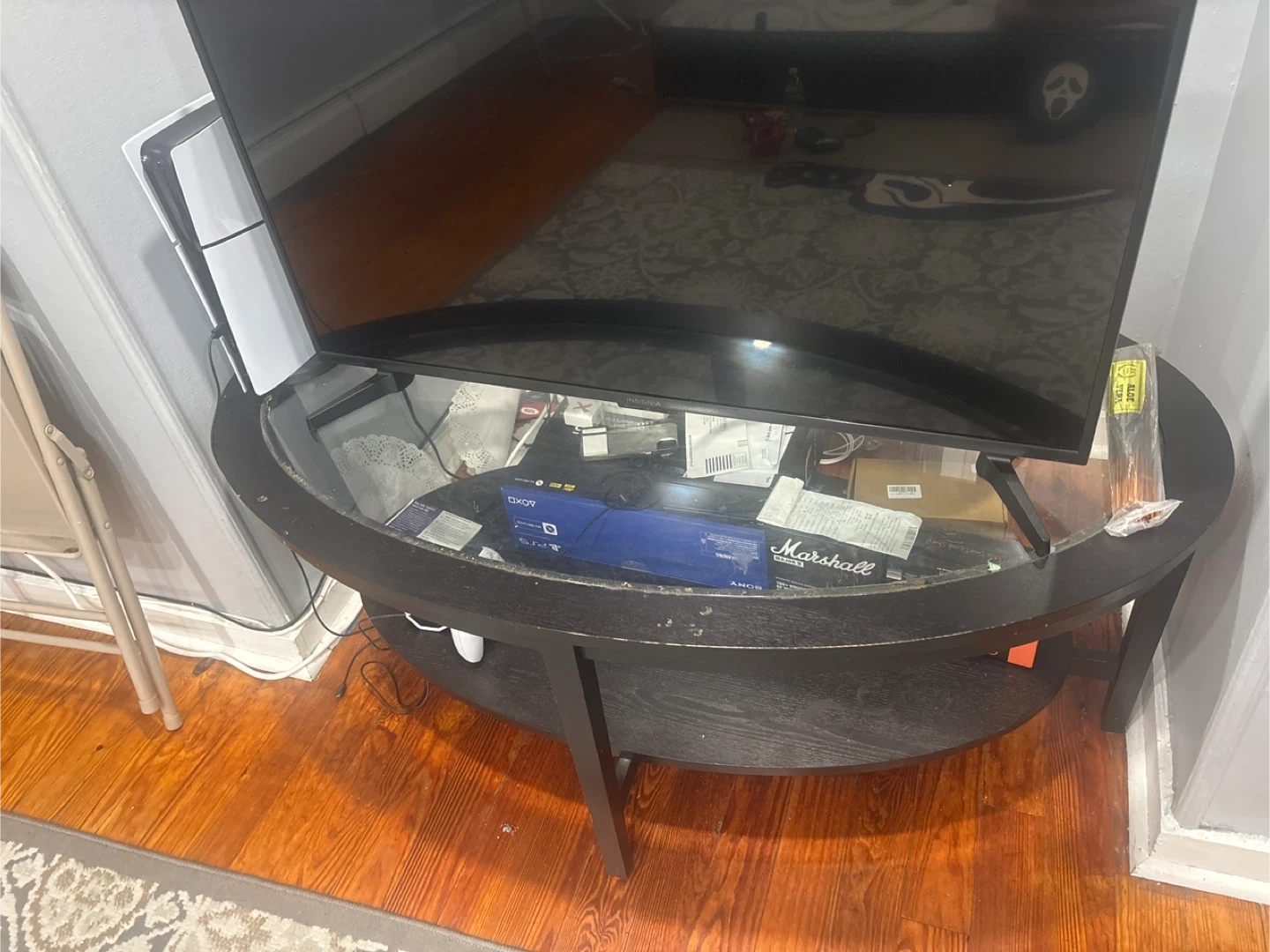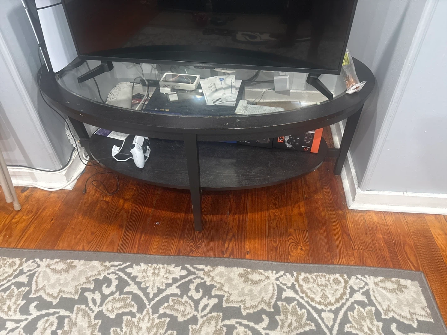 Selling a used black TV stand with a glass top! It has a unique oval shape and a lower shelf for extra storage. Perfect for a smaller TV or as an accent piece in your living room. It's in good condition and ready for a new home