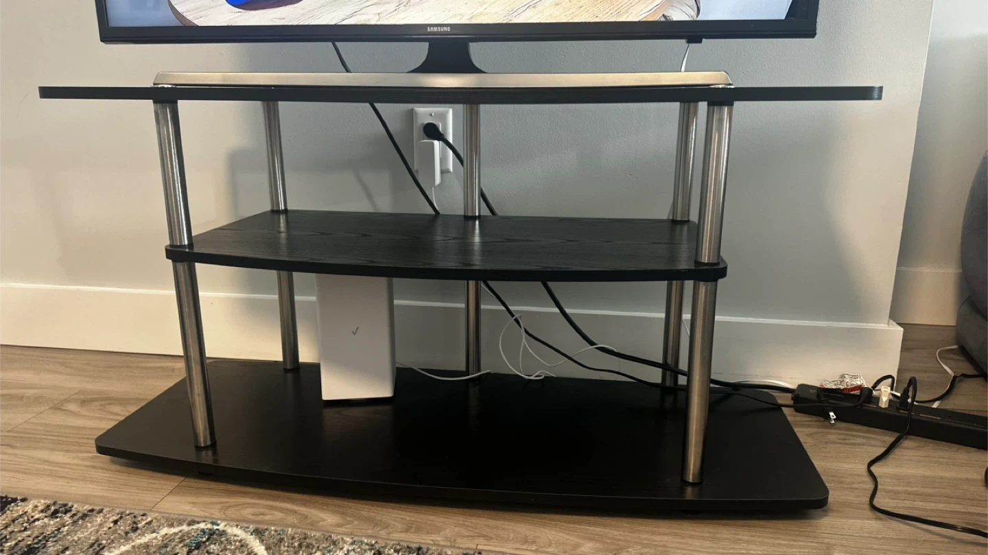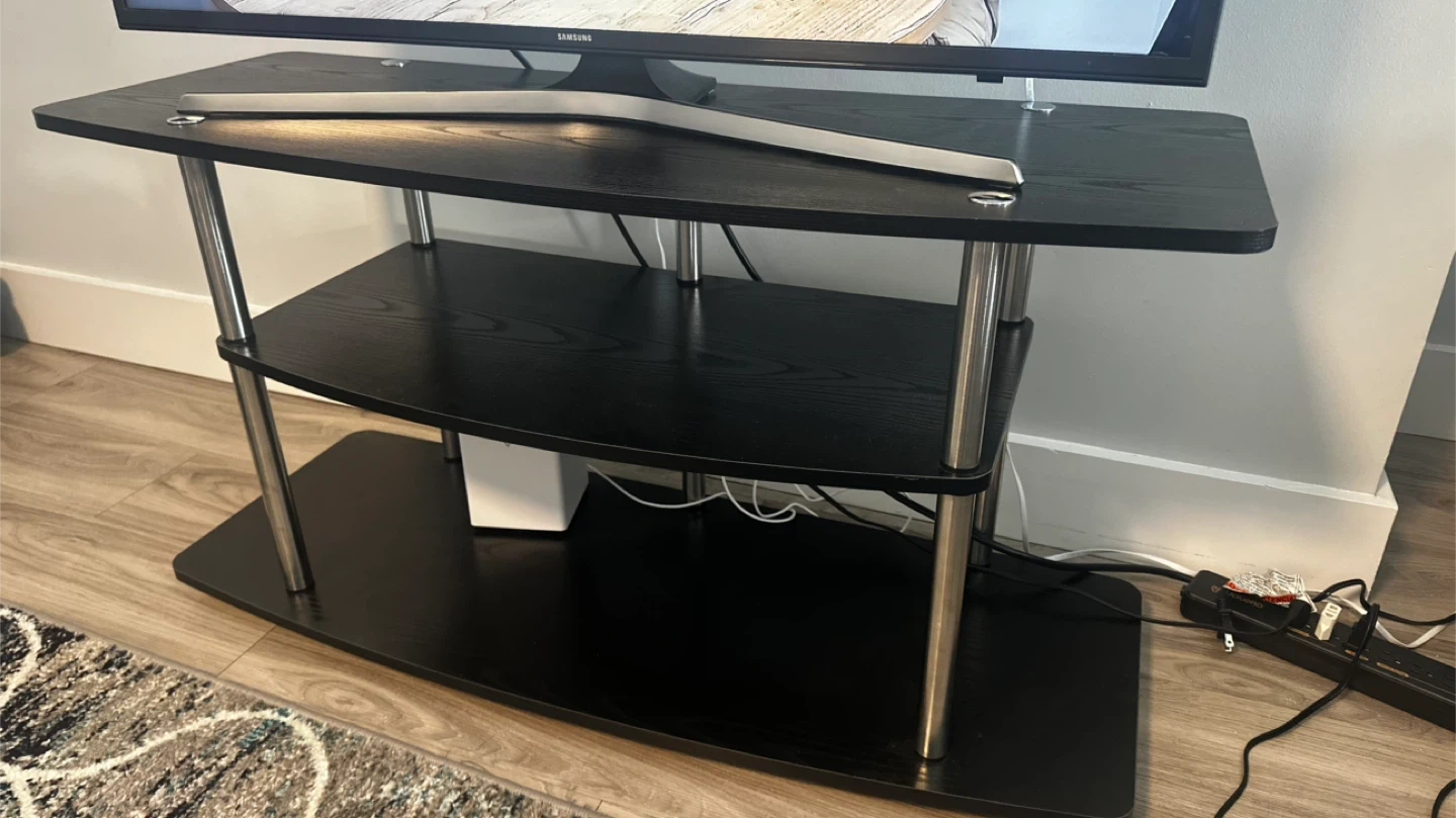 Selling a black TV stand with shelves. It's in great condition and ready for a new home! The stand has a sleek design with multiple levels for storage or display. Perfect for organizing your entertainment area!