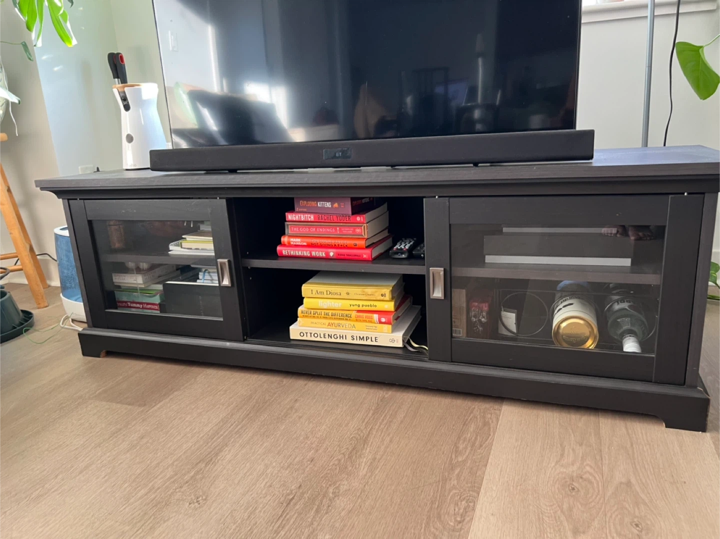 60Selling a black TV stand with sliding glass doors. It's in great condition and ready for a new home!