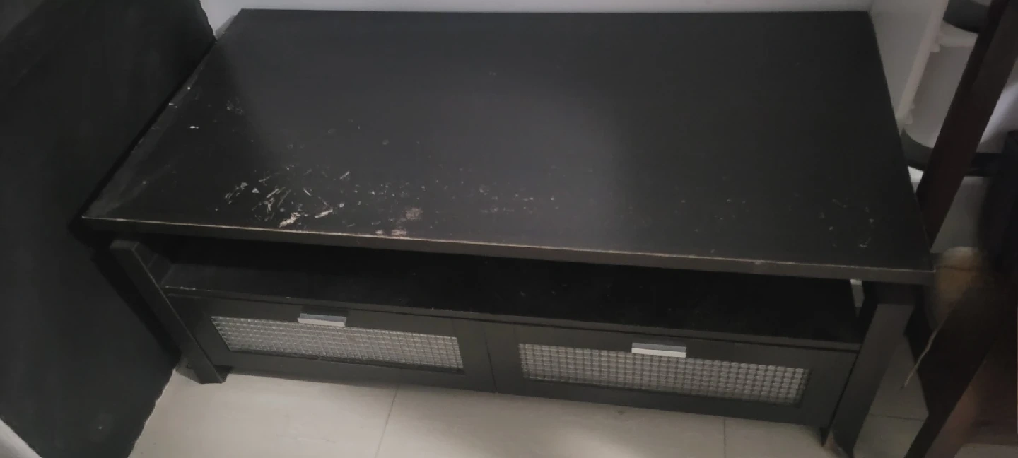 20Free black TV stand with a storage shelf and two doors. It has some wear and tear on the top surface, as shown in the pictures. Perfect for a living room or entertainment area! Pick up at my home.