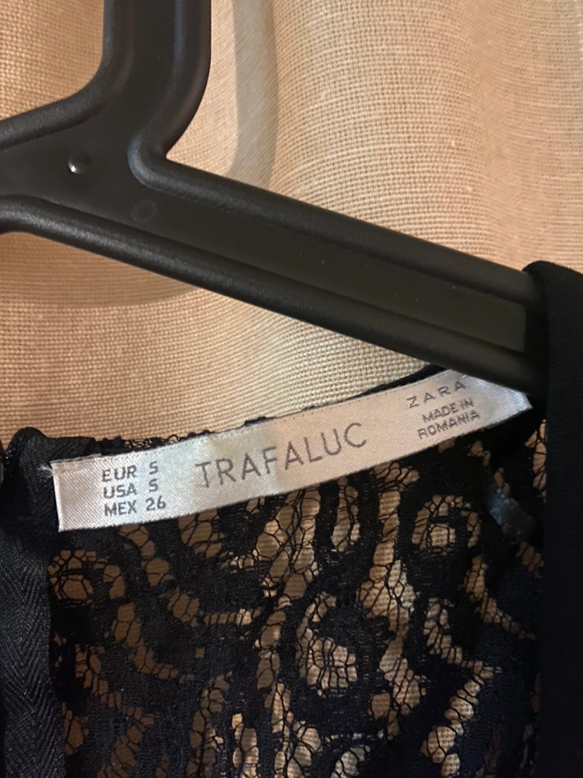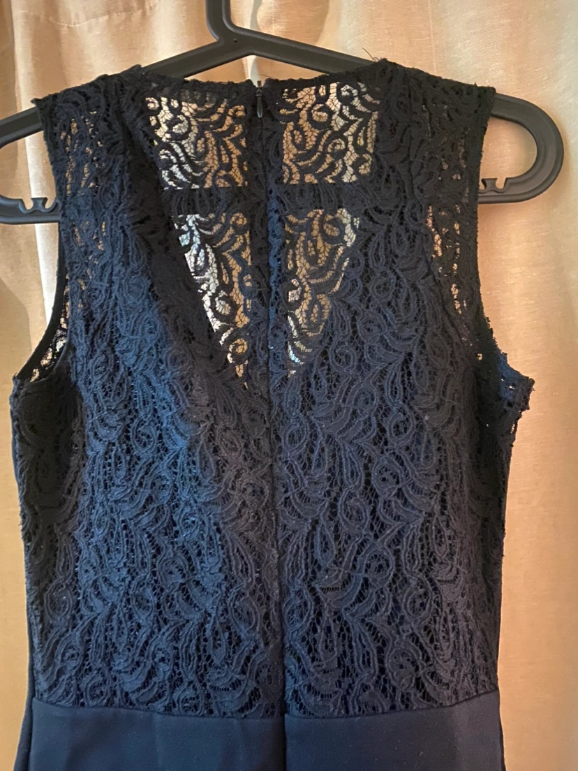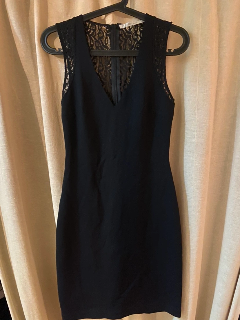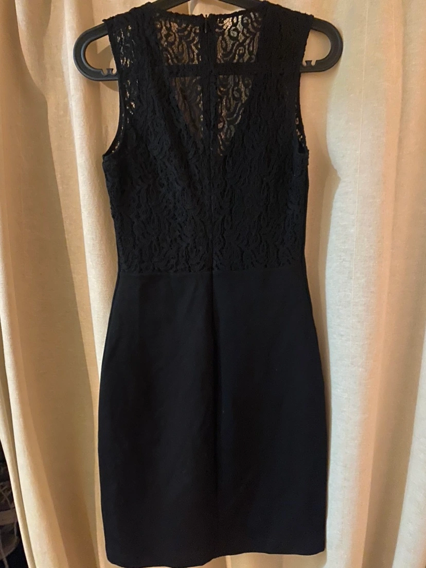 106This is a sleeveless black dress with lace detailing on the back. It is a form-fitting dress that is perfect for a night out. It is in good condition.