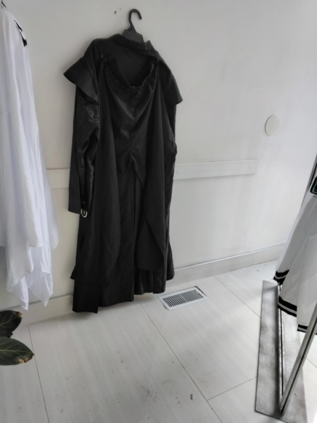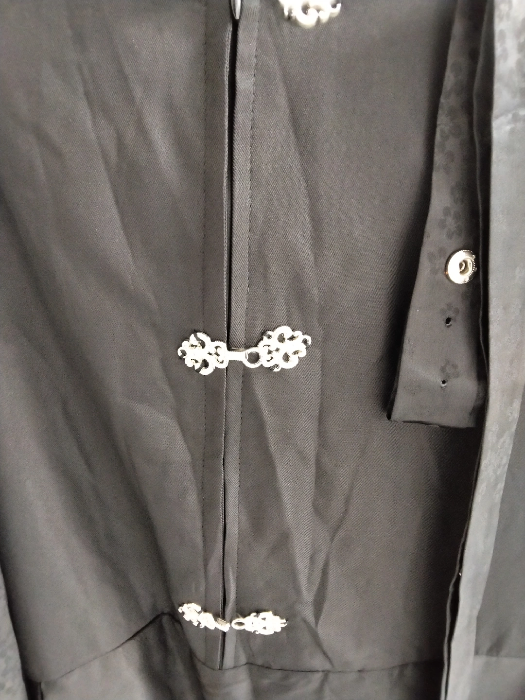 Selling a black coat with unique decorative embellishments! It features patterns on the sleeves and ornate clasps. The coat is made of a dark, and has a distinctive design. It's in good condition and ready for a new home! Halloween costume Adult