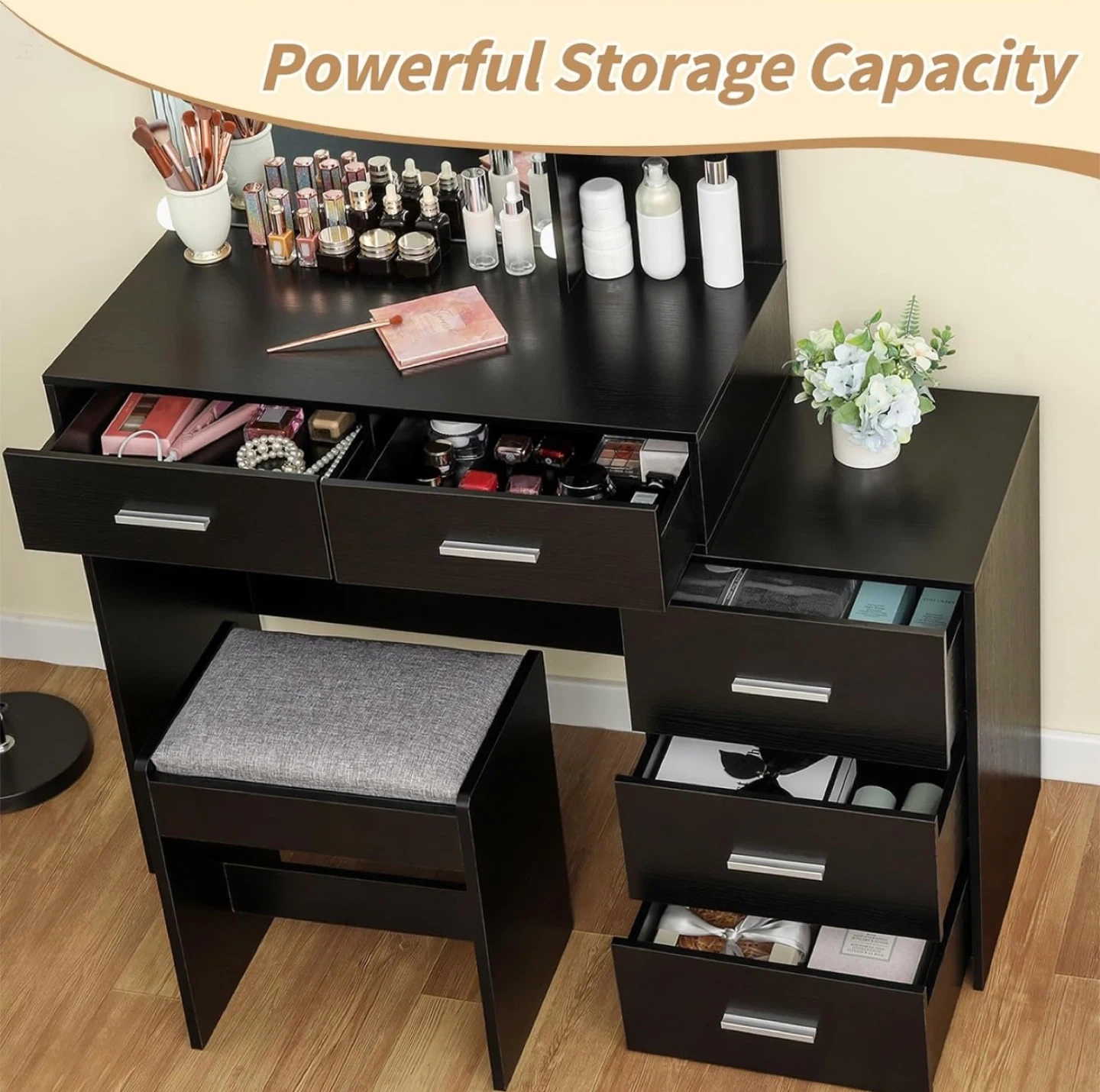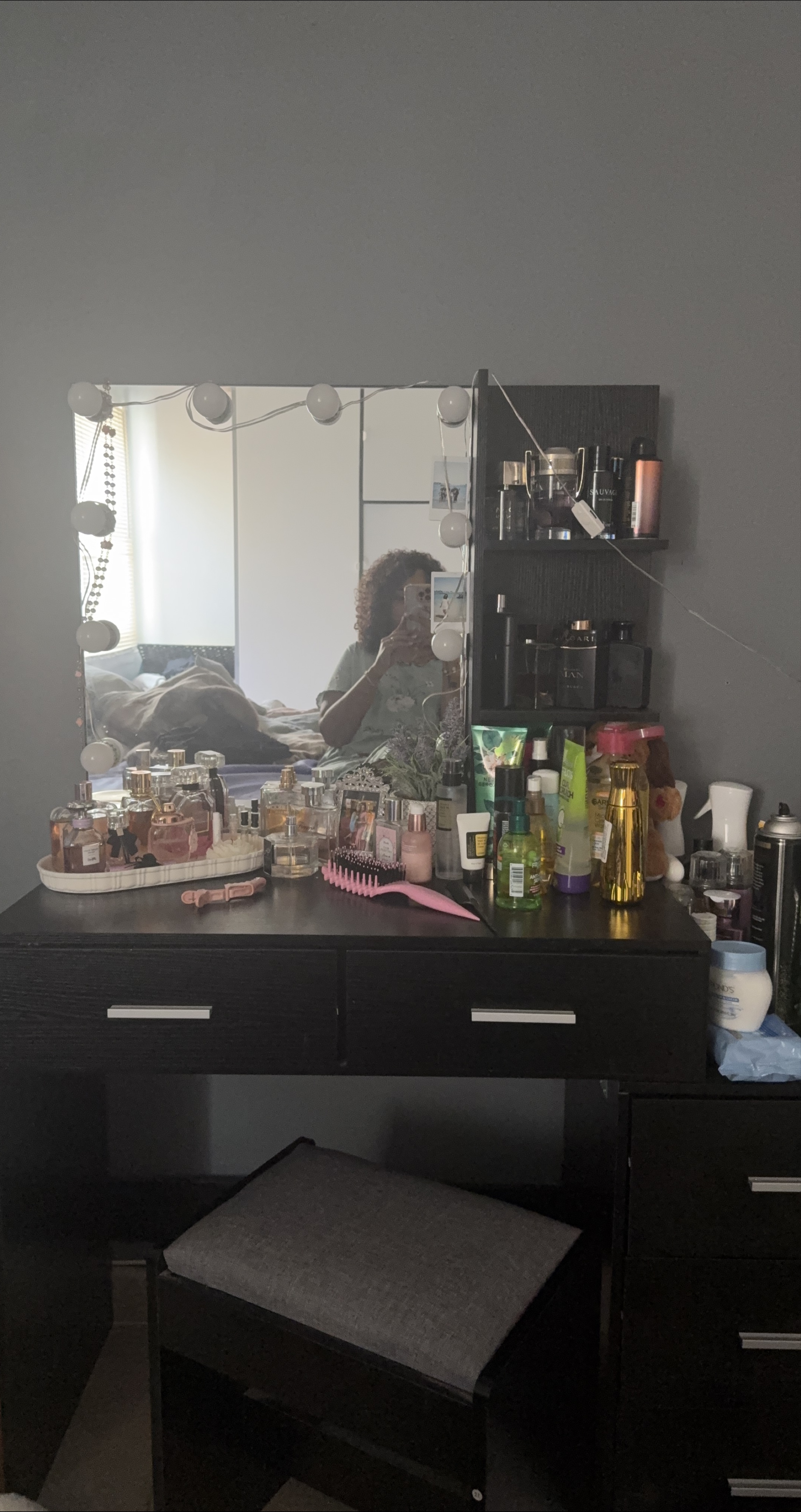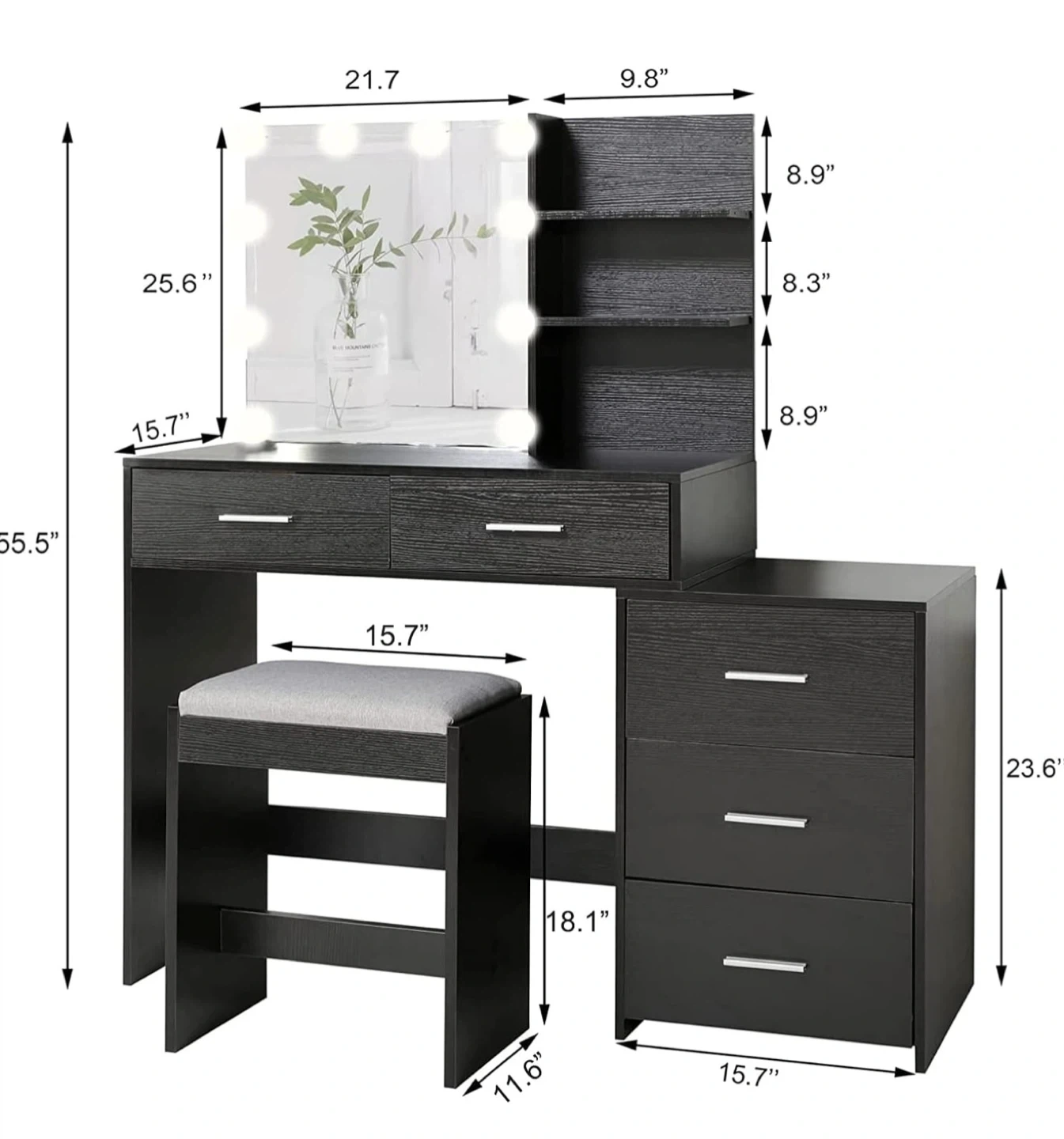 Selling a black vanity table with a lighted mirror and stool! It has a powerful storage capacity with drawers and shelves for all your beauty essentials. The dimensions are: - Tabletop Height: 55.5" - Mirror: 21.7" wide x 25.6" high - Side Shelves: 9.8" wide - Stool: 15.7" wide x 11.6" deep x 18.1" high