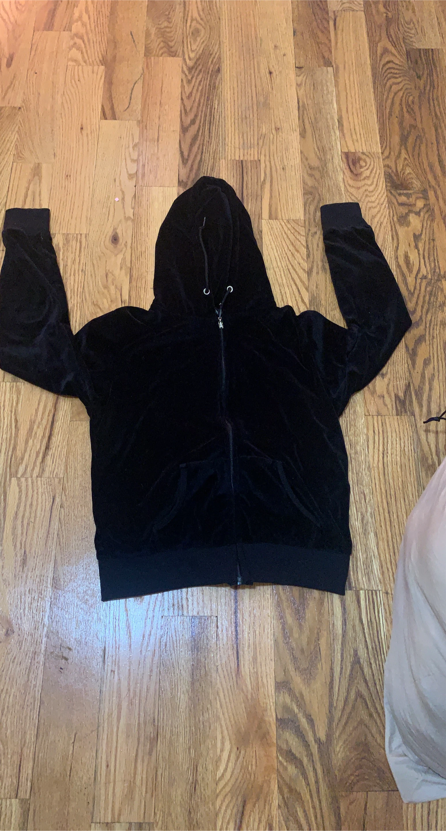 5Selling a black velour zip-up hoodie. It's super soft and comfy, perfect for layering or just lounging around! Only used 5 times size M