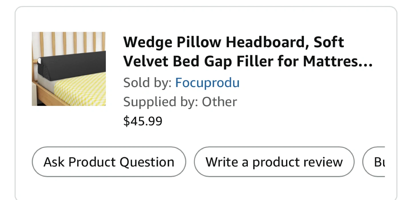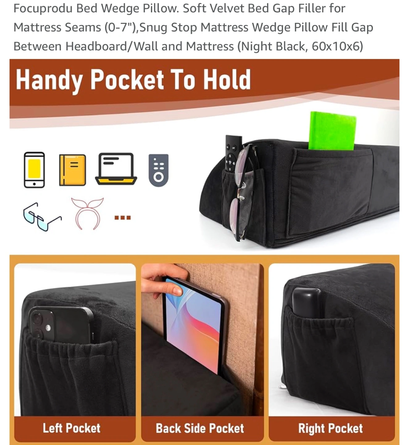 16Soft velvet bed wedge pillow. Fills gap between headboard/wall and mattress. Handy pocket to hold remotes, phones, etc. Night black, 60x10x6 inches. New - size was too big for my bed & couldn’t return due to sizing.
