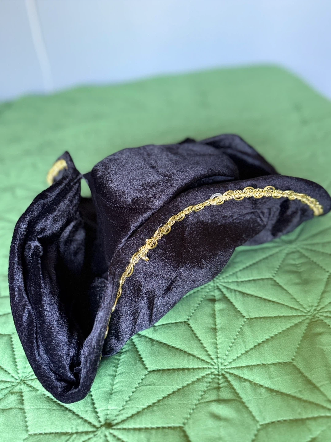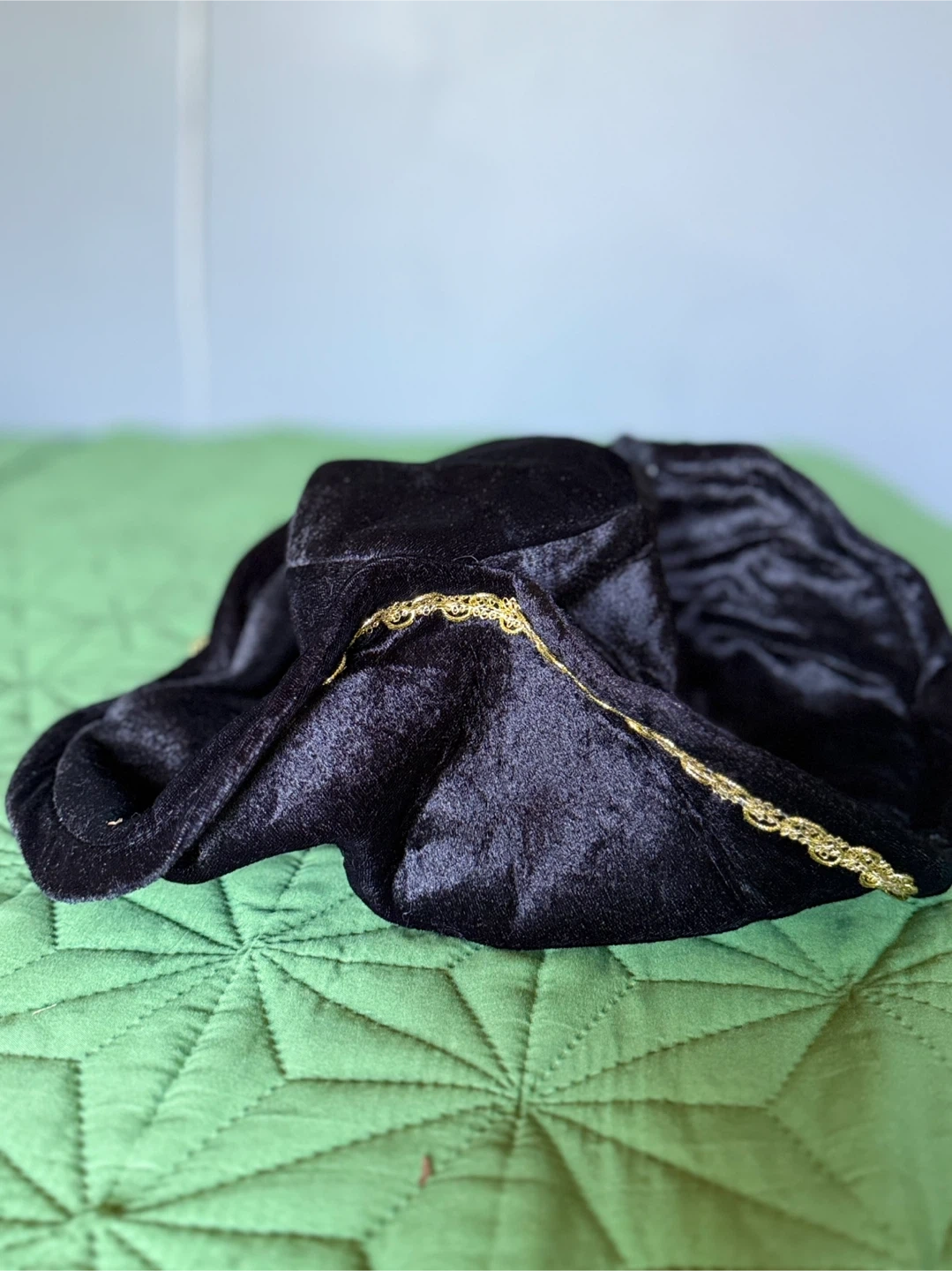 Here's a cool black velvet pirate hat, perfect for costumes or dress-up! It features a stylish gold trim that adds a touch of flair. It's in great condition and ready for a new adventure. Please check my other listings… to match the hat! ☺️
