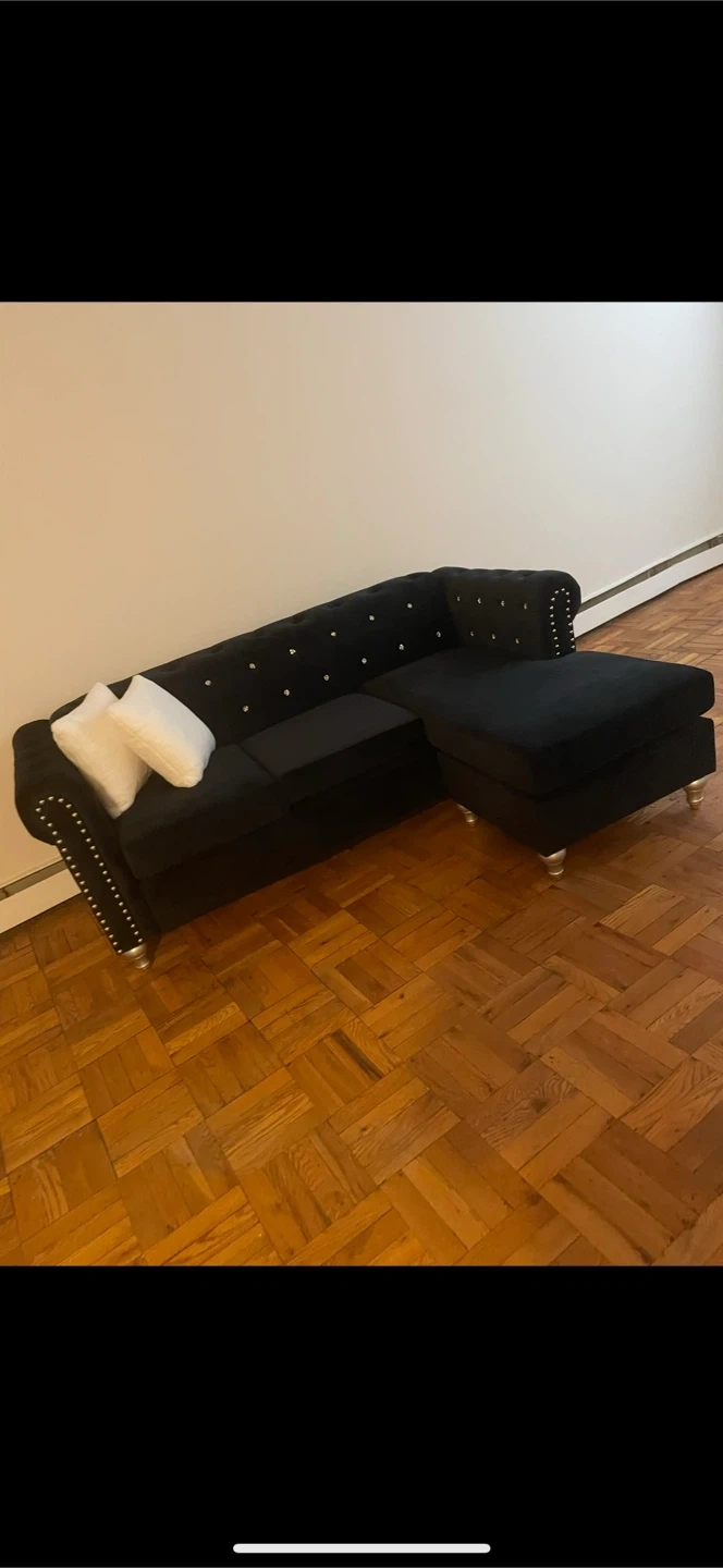 15Selling a comfortable black velvet sectional sofa. It features a chaise lounge and comes with two white pillows. The sofa is in good condition and would be a great addition to any living room