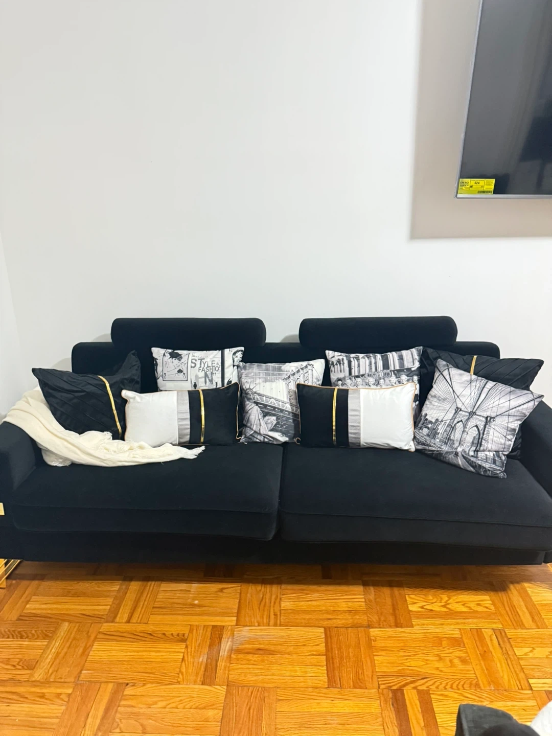 10Selling a stylish black velvet sofa! It comes with a set of decorative pillows as pictured. The sofa features a sleek design with gold-tone legs, adding a touch of elegance to any living space. It is in great condition and ready for a new home!